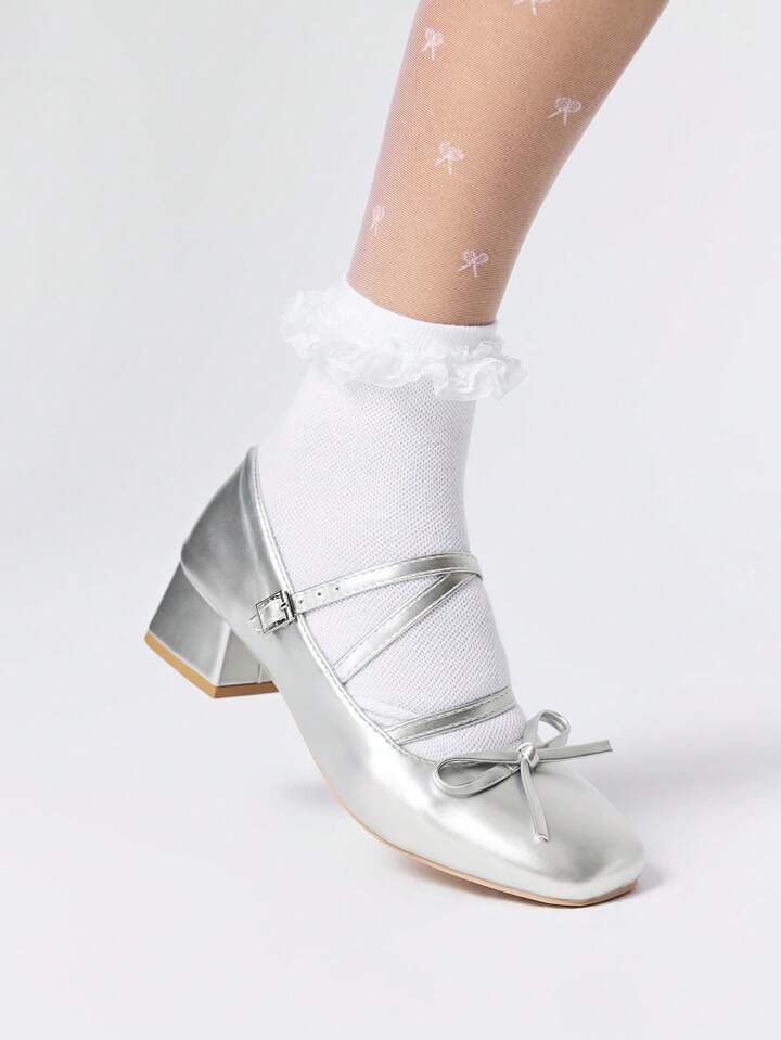 Kawaii Zapatos tipo Mary Jane plateados para mujer, de punta cerrada, tacón ancho, con hebilla de moño, zapatos de tacón formales para el trabajo