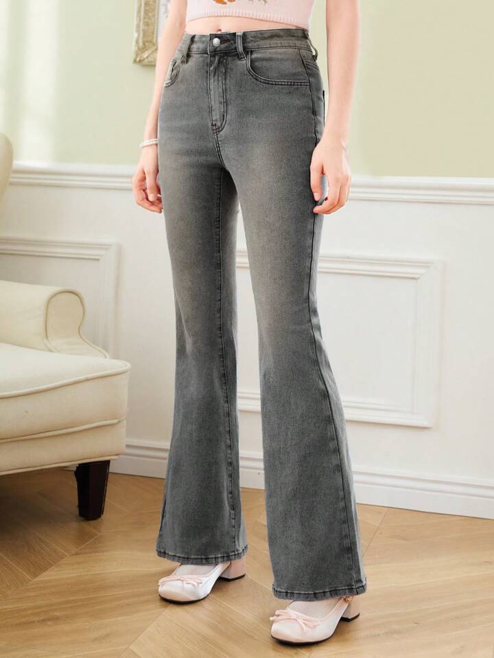 Kawaii Bailarinas dulces para mujeres con bolsillo bordado en la parte trasera, pantalones vaqueros con pernera acampanada