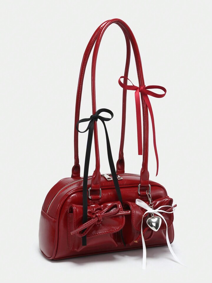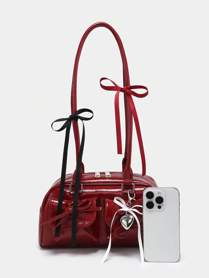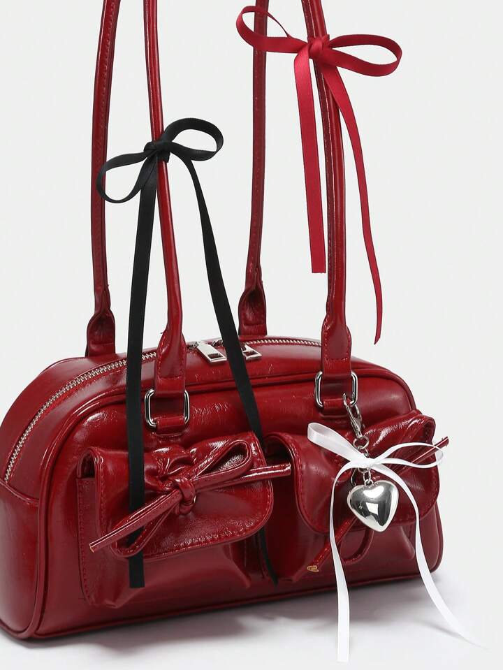 Kawaii Bolso de hombro/axila de mujer estilo vintage lindo con decoración de lazo, corazón de cereza y múltiples bolsillos, tipo Bolso de Boston
