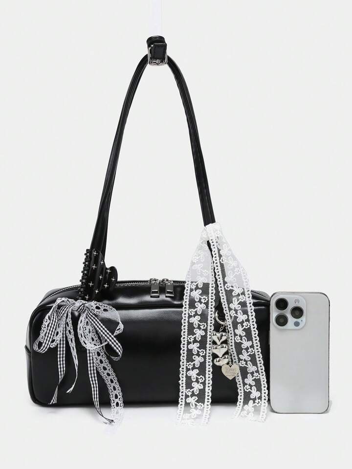 Kawaii Bolso de hombro / de mano con múltiples bolsillos, decoración de corazón y diseño de lazo vintage, estilo Boston, para mujer