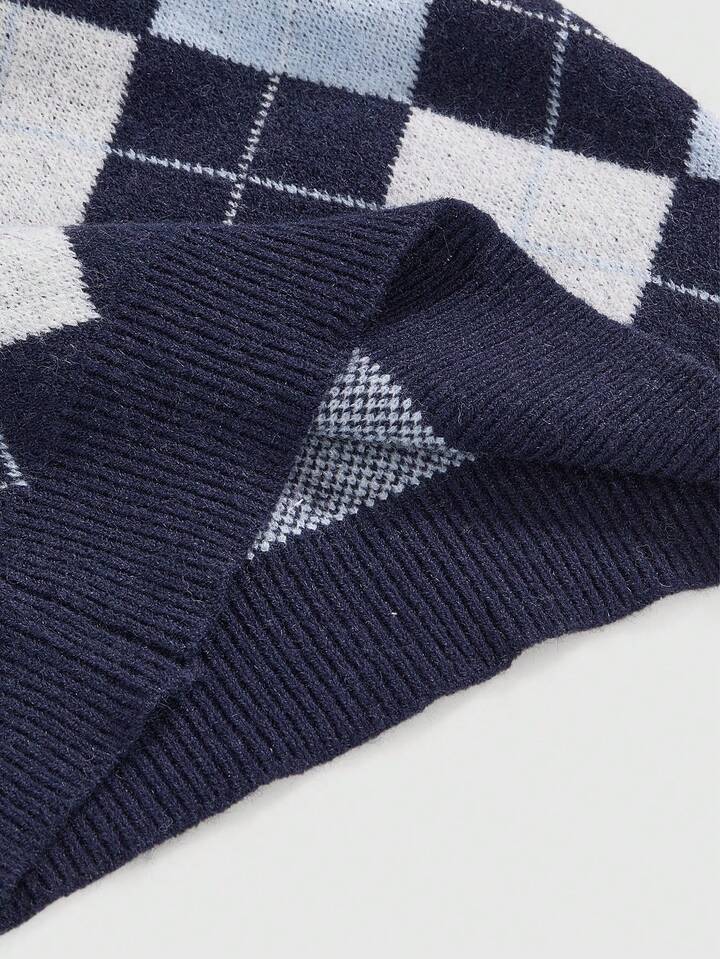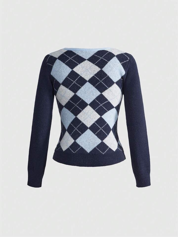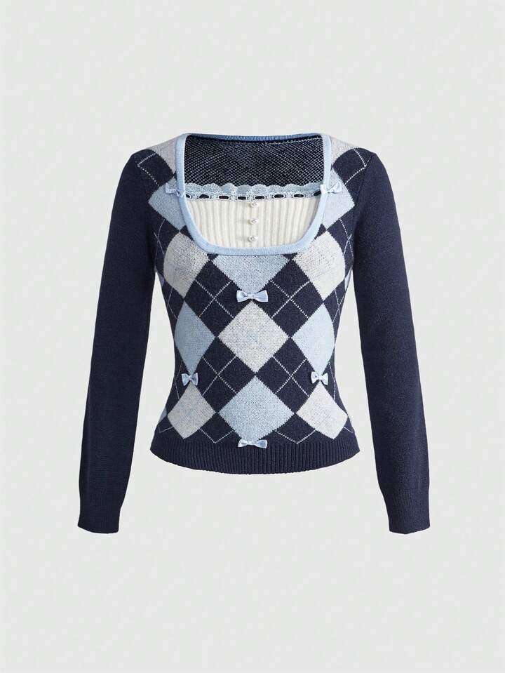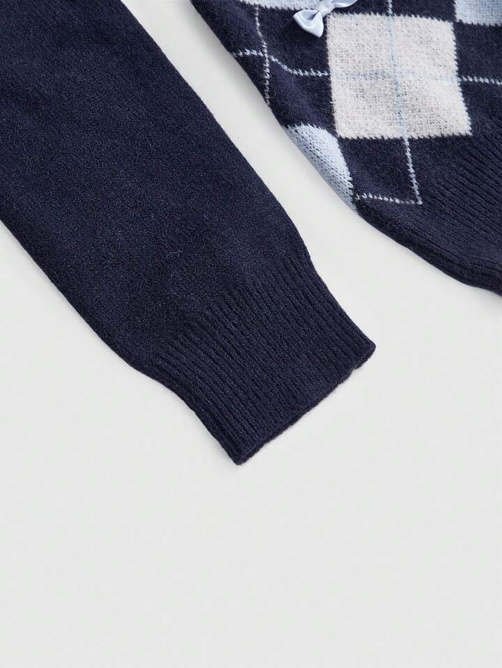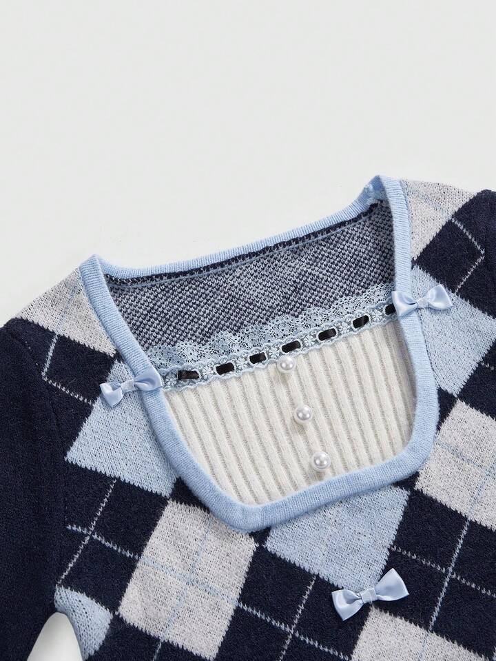 Kawaii Jersey ajustado con estilo preppy Y2K, diseño de cuadros argyle y moño lindo
