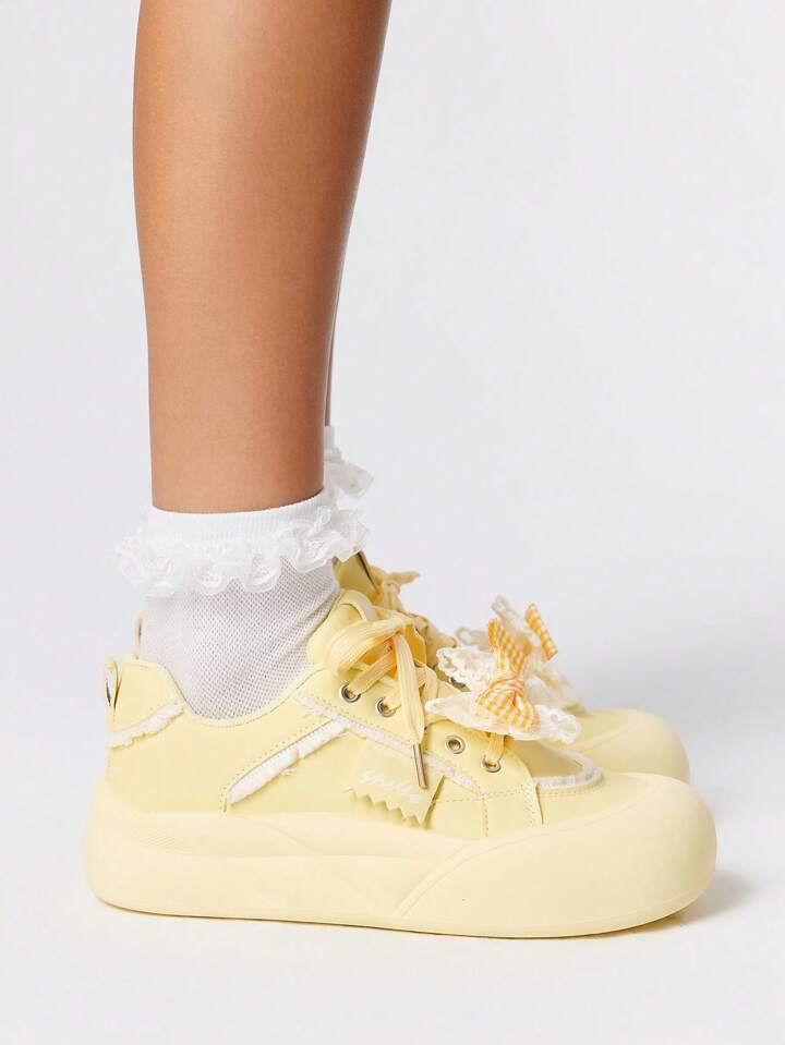 Kawaii Zapatillas de plataforma con moño amarillas para mujer, calzado vulcanizado casual de diseño único y suela gruesa