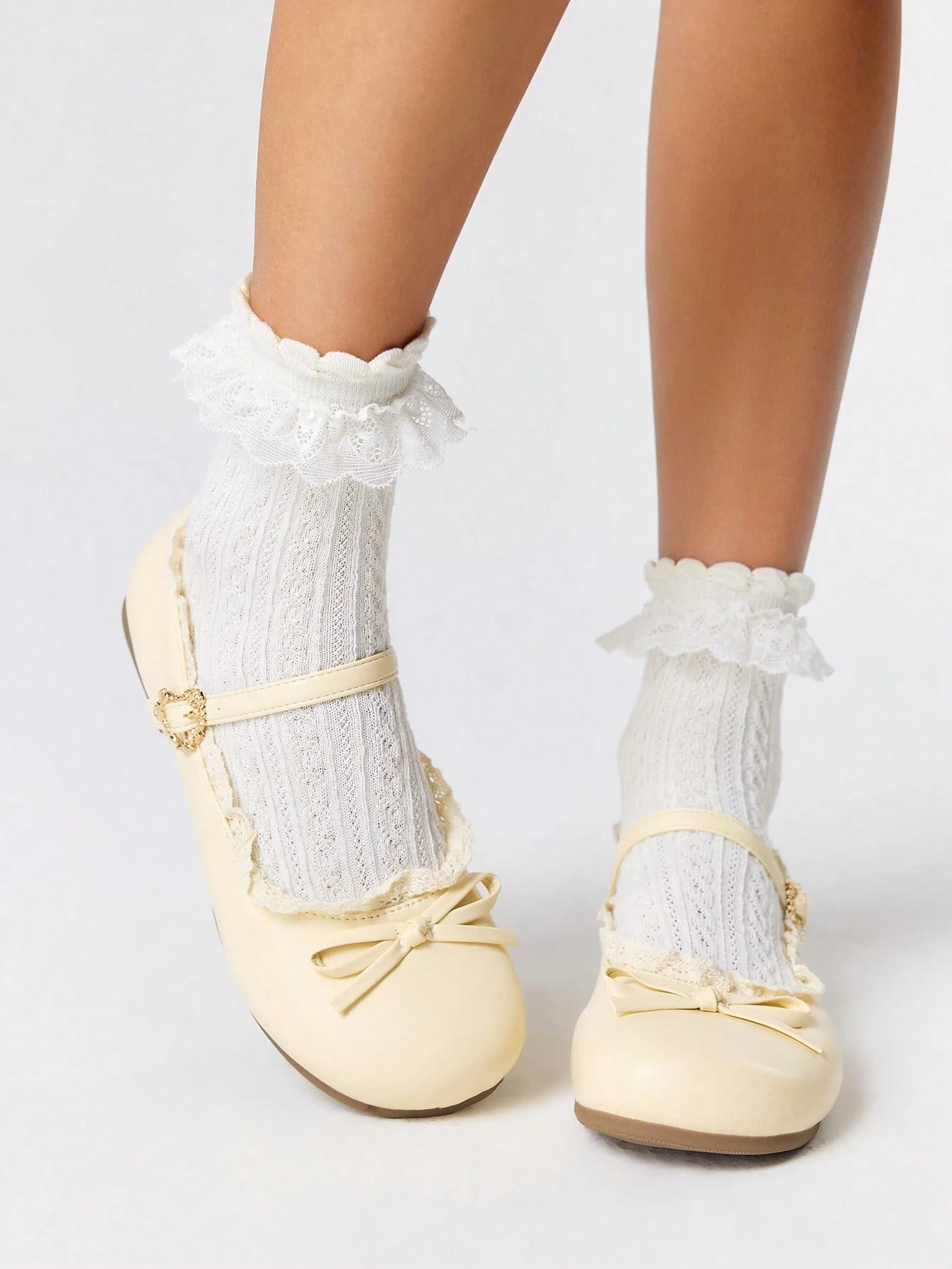 Kawaii Zapatos de mujer tipo mocasín amarillos con punta cerrada, estilo Mary Jane, bailarinas tipo Lolita con lazo