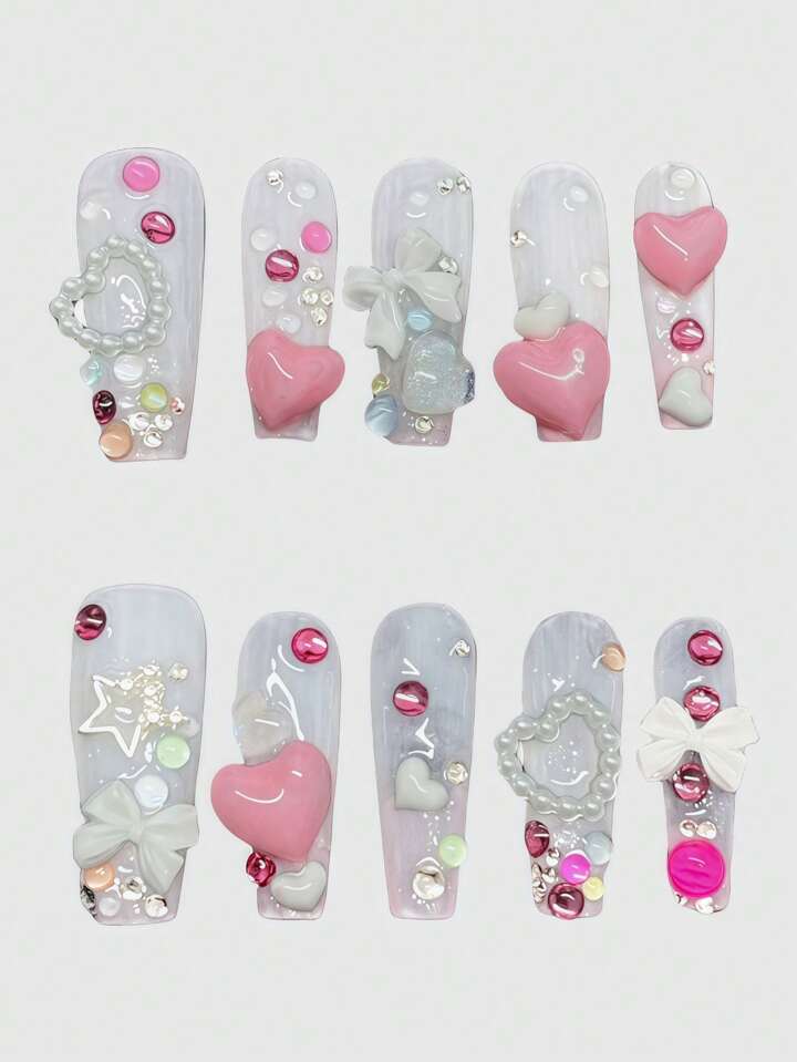 Uñas postizas largas y cuadradas hechas a mano dulces y de colores Kawaii Y2K con lazo 3D en forma de corazón, lunar de puntos y lechoso
