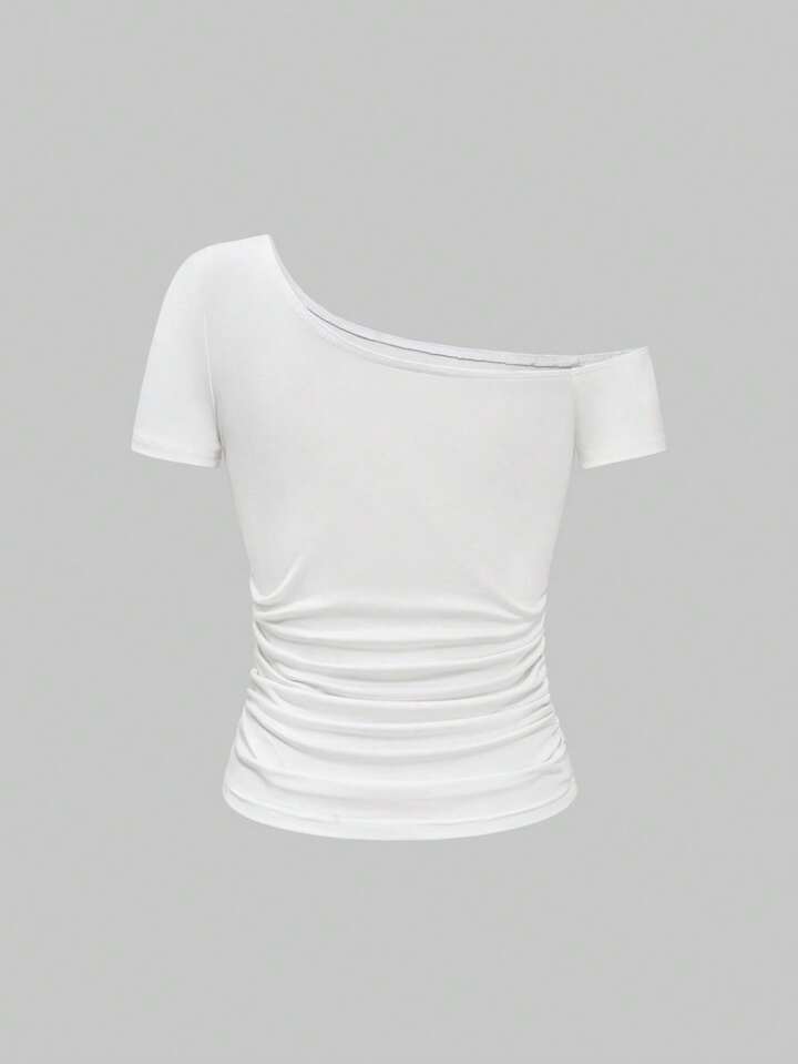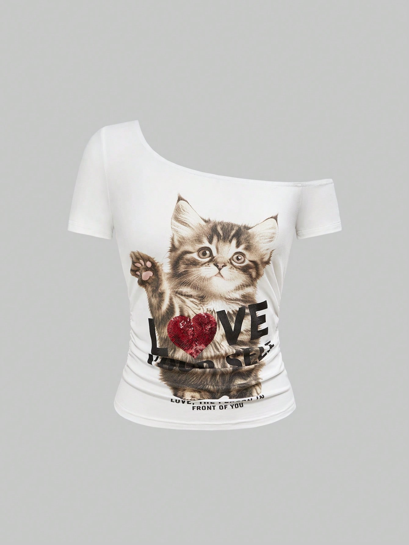 Kawaii Camiseta ajustada de mujer con cuello asimétrico, estampado de gato y corazón, decoración con rhinestones y eslogan de estilo Y2K