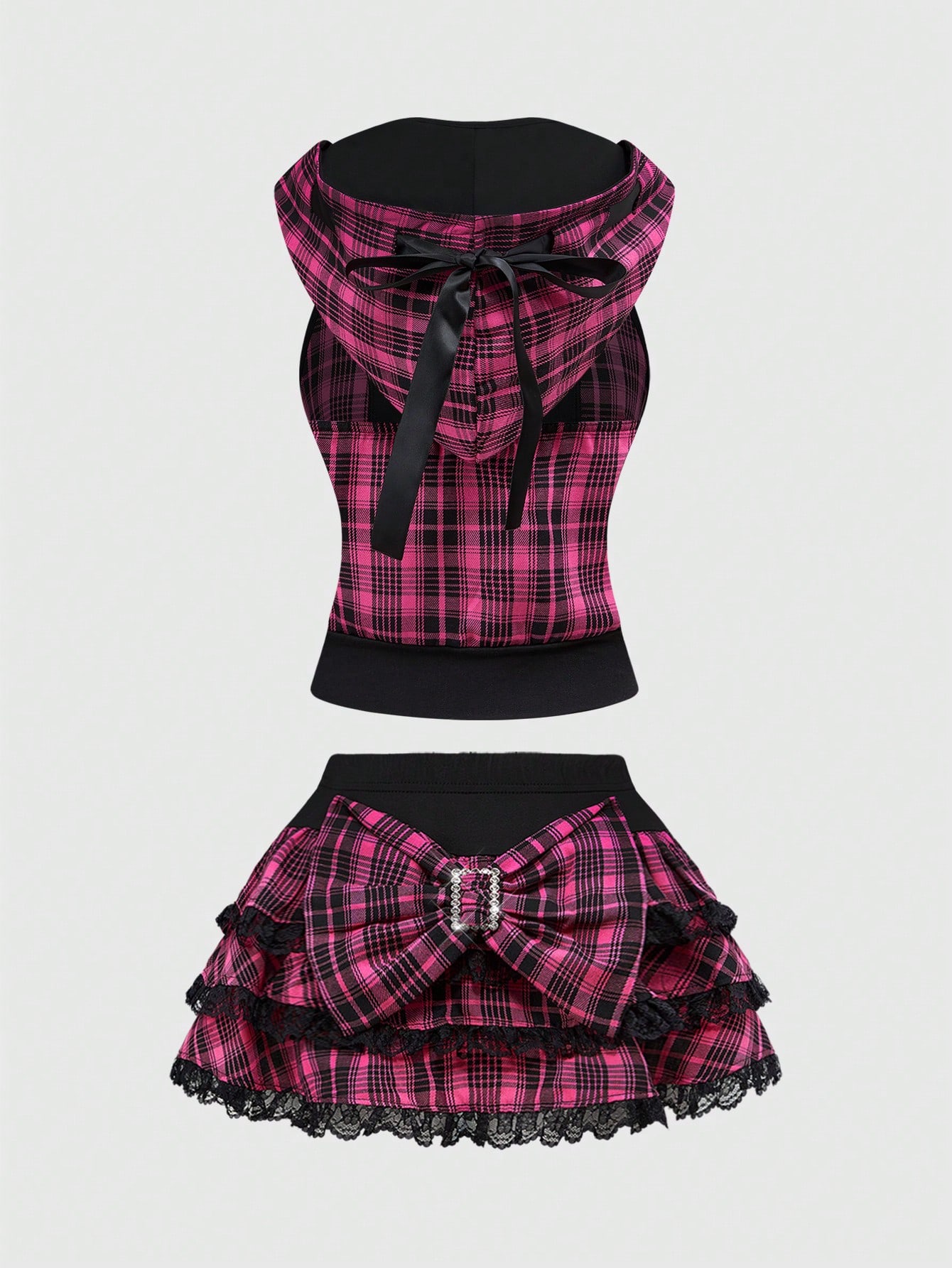 Kawaii Conjunto de 2 piezas de estilo Y2K Harajuku con top corto con lazo ancho y falda con volantes a cuadros