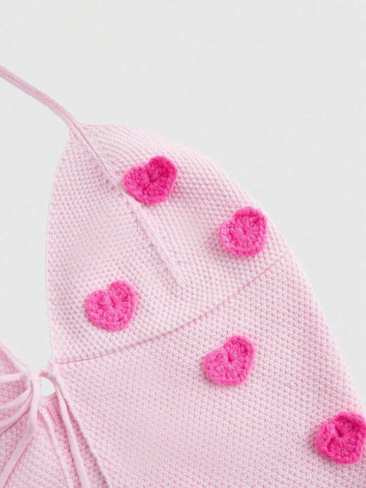 Kawaii Top de punto sin mangas de color rosa intenso con corazón de crochet jacquard Y2K para mujer