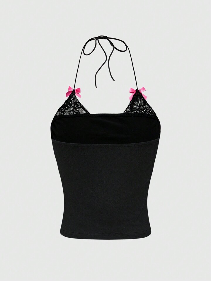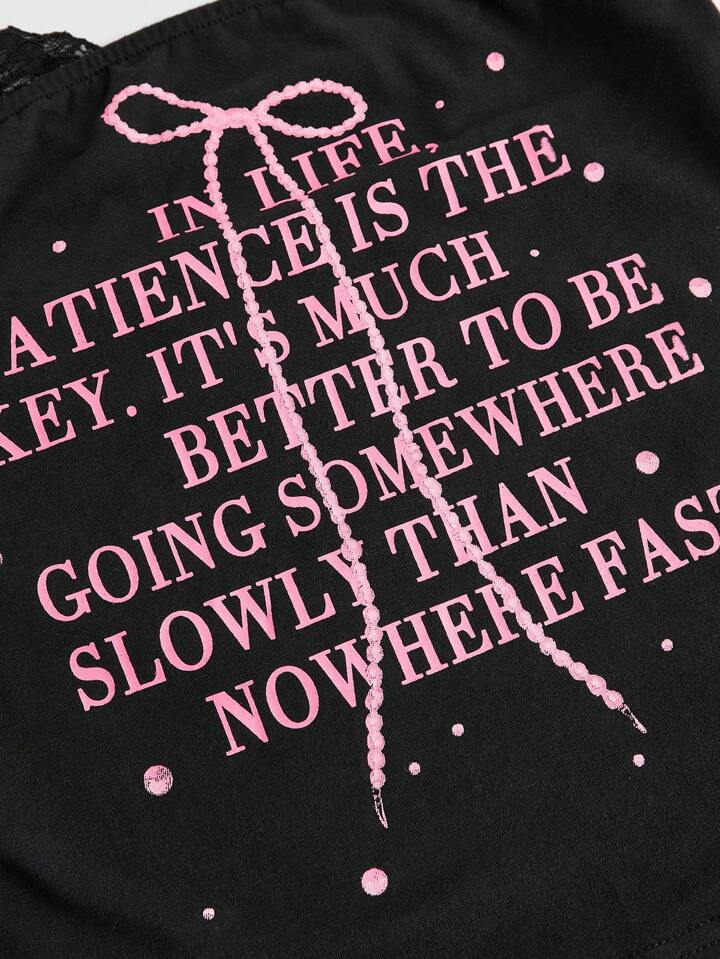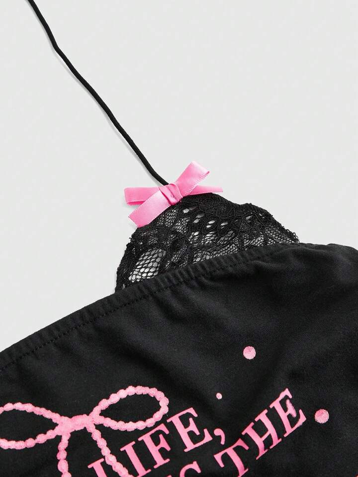 Kawaii Top de camisola con tirantes finos, adornos de encaje y estampado de letras en estilo Y2K