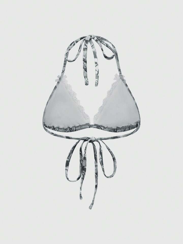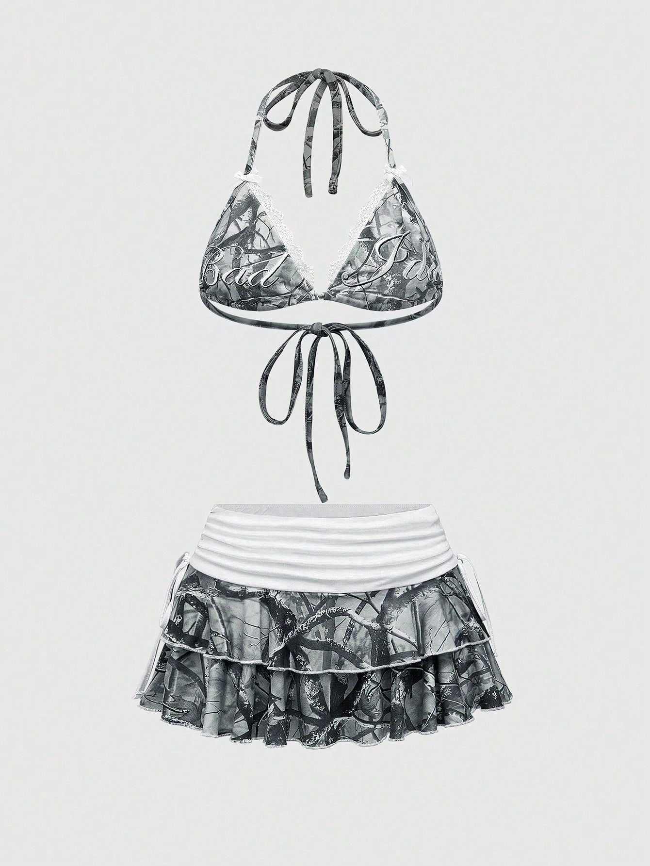Kawaii Conjunto de bikini con contraste de estampado de camuflaje, parches de encaje bordados y color en Y2K sexy