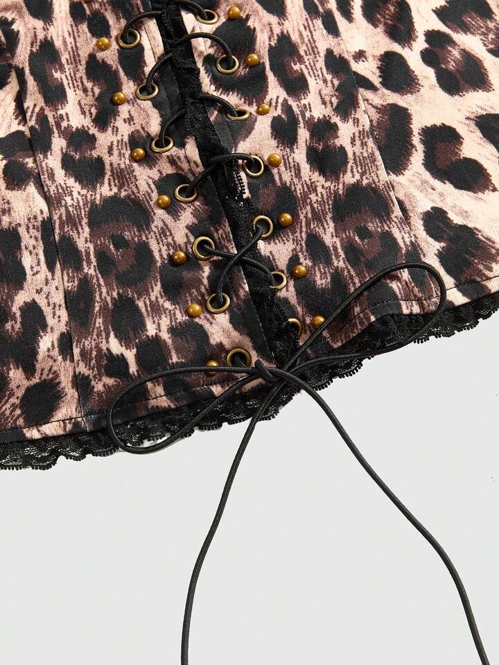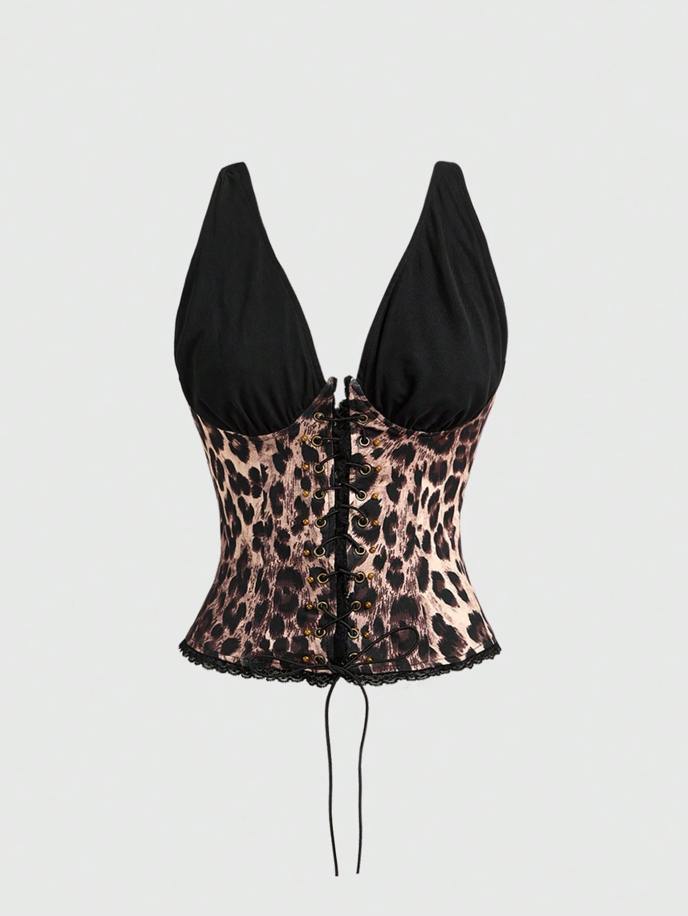 Kawaii Top de mujer con parches de malla, estampado de leopardo, cordones metálicos y ojales sexy de estilo Y2K
