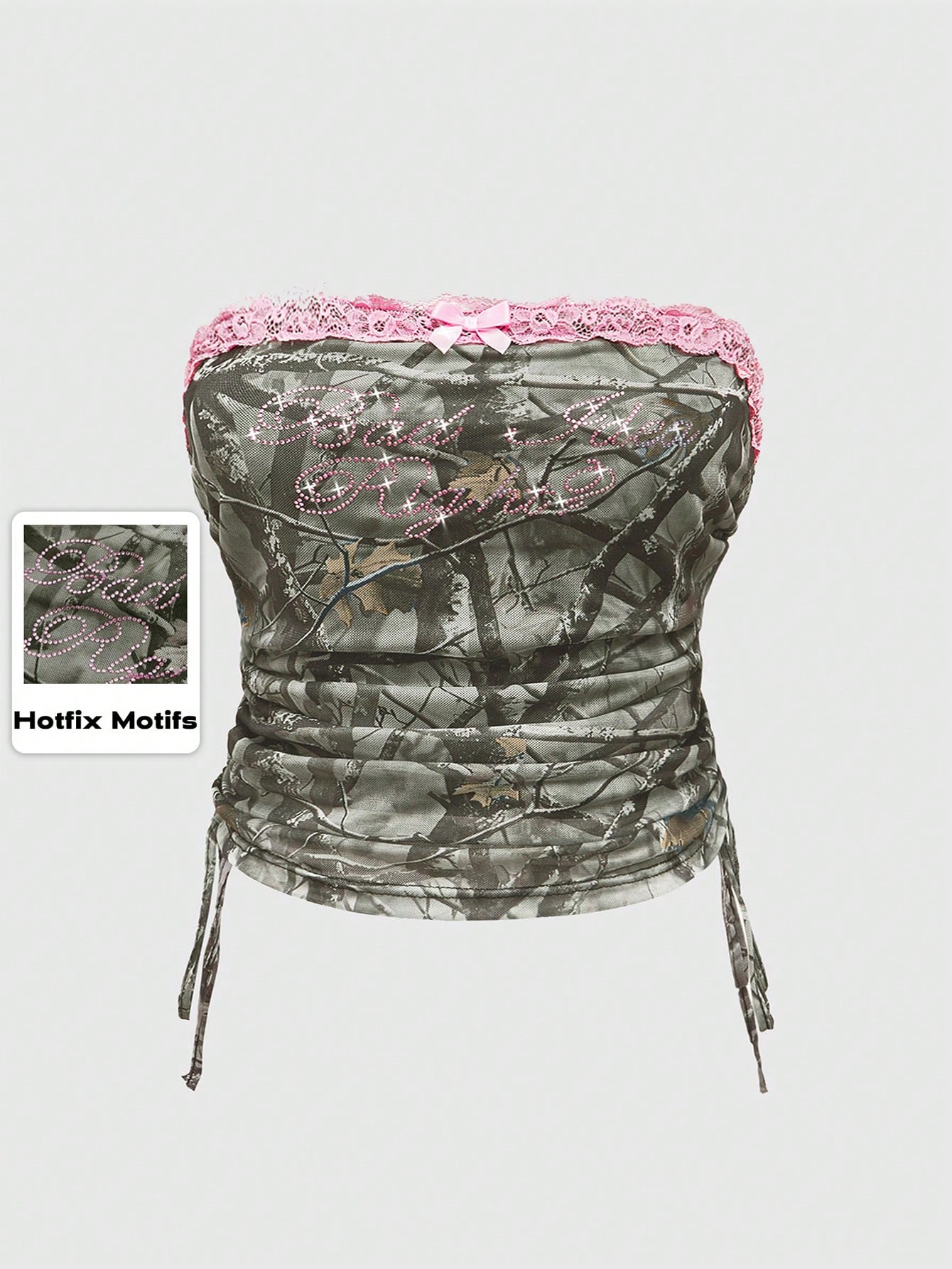 Kawaii Top corto holgado con cordón, estampado de camuflaje estadounidense vintage Y2K con aplicaciones de strass para mujeres de talla grande
