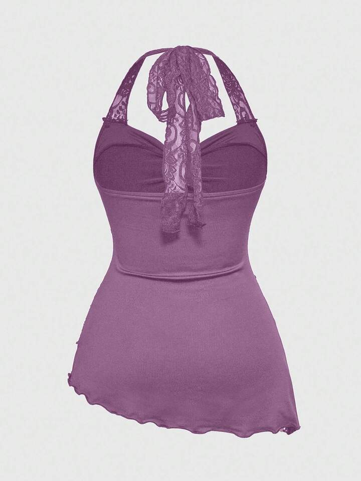 Top de mujer con cuello halter, cintura con lazo, bajo asimétrico con encaje y parches de punto