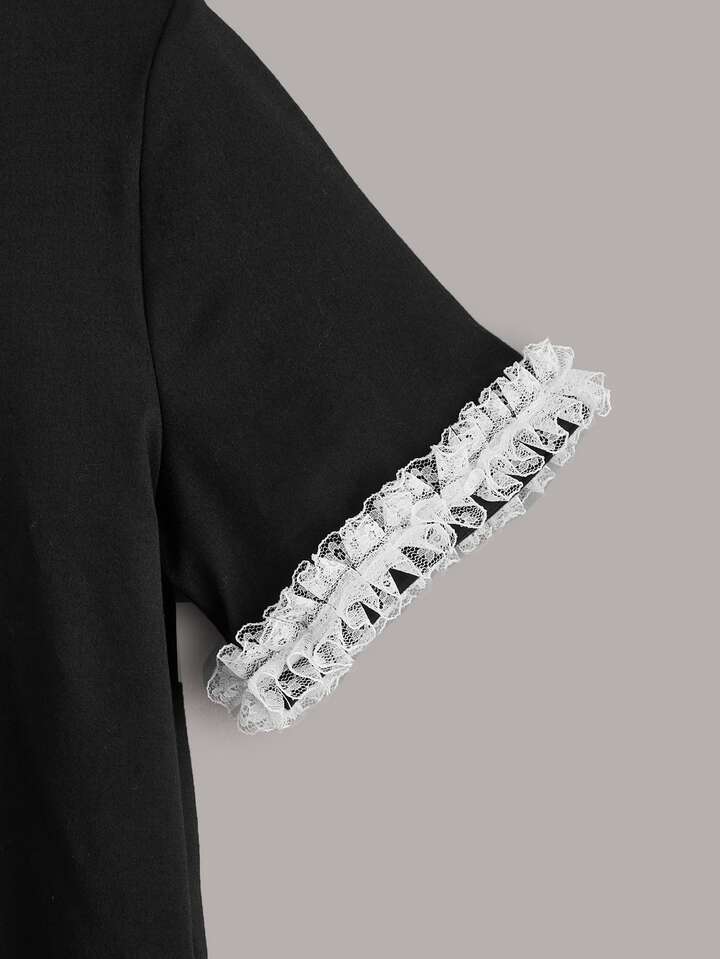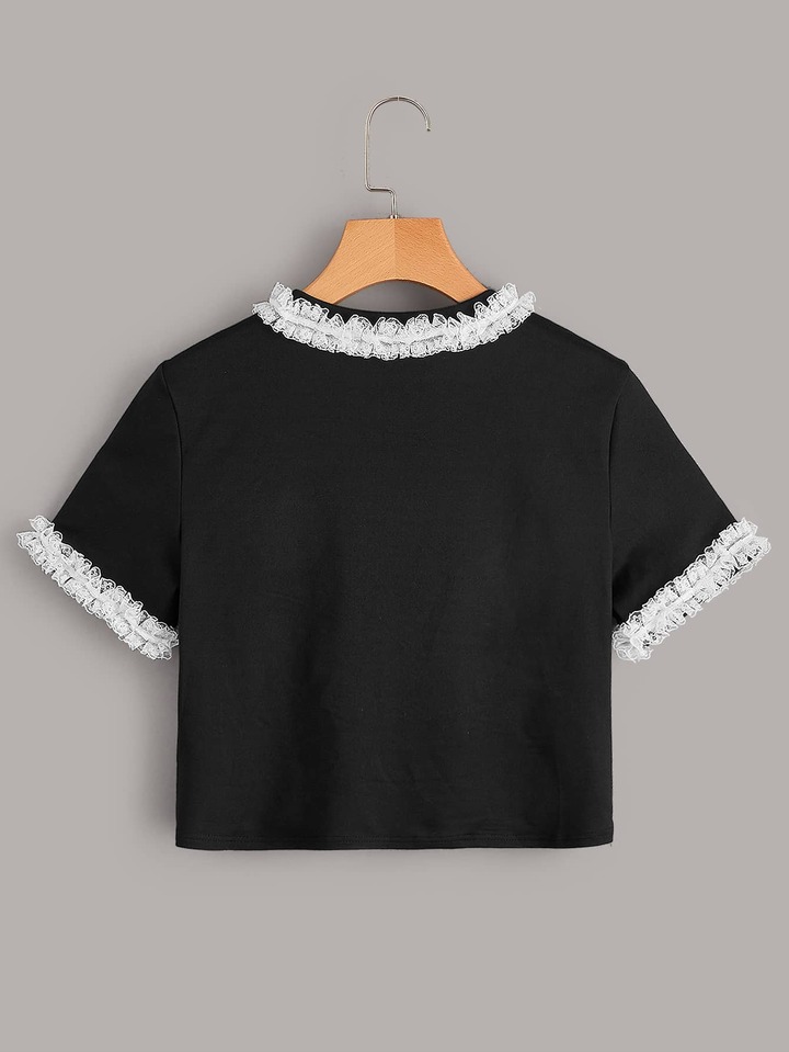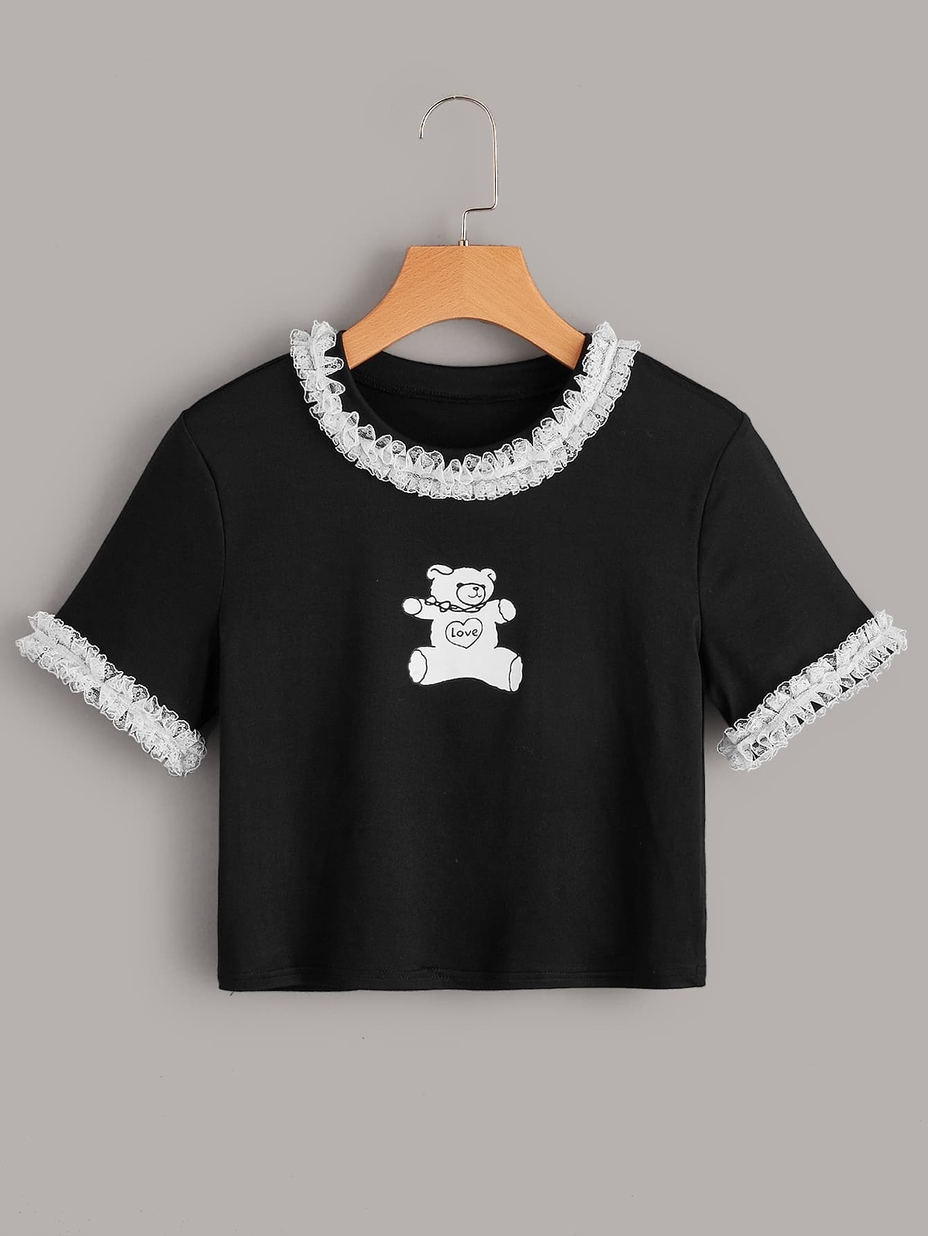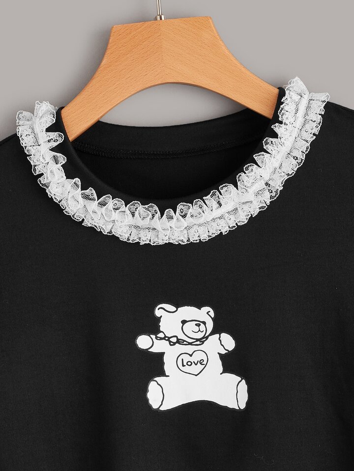 Camiseta ribete con encaje con estampado de oso de dibujos animados