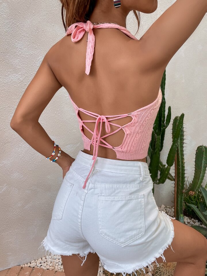 Top tejido corto de cuello halter de espalda con cordón