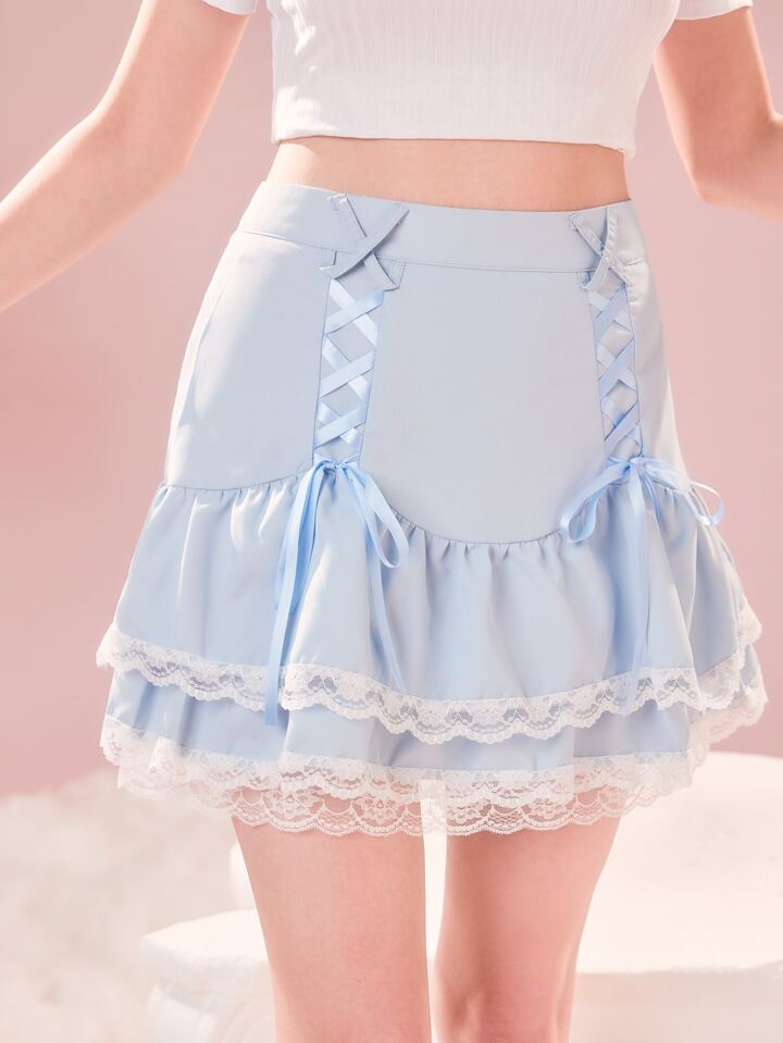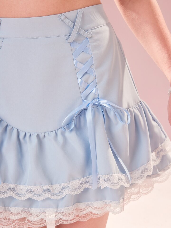 Falda De Encaje Con Cordones, Con Encaje De Contraste Y Dobladillo De Volantes