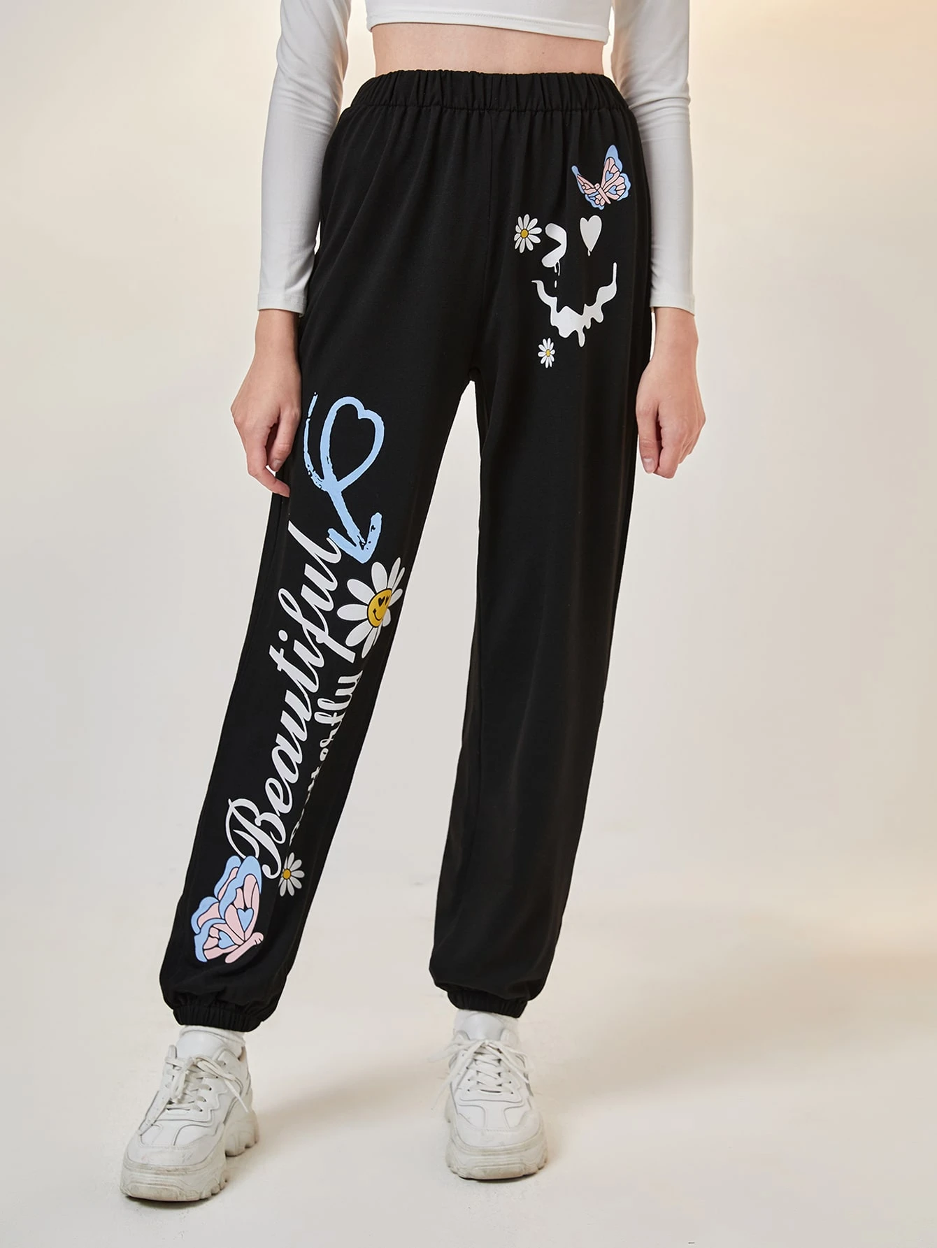 Pantalones deportivos con letra con estampado de mariposa de cintura elástica