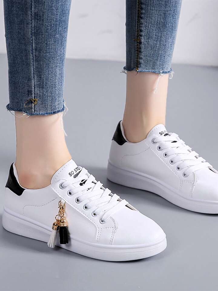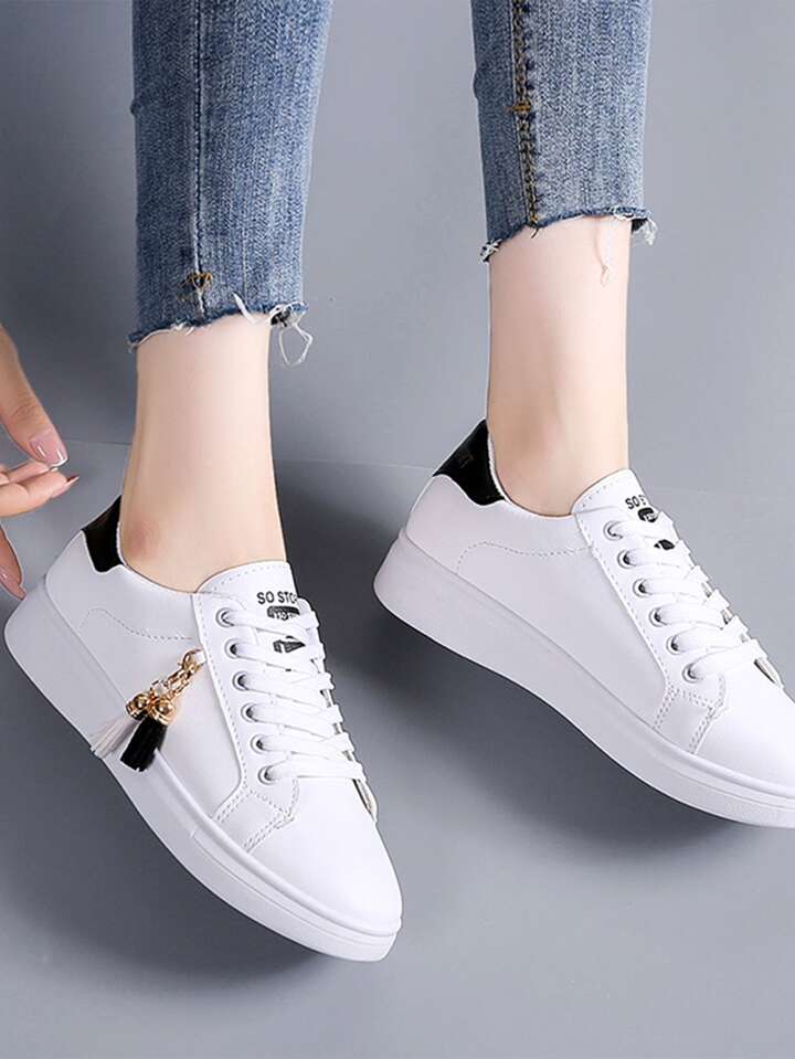 Zapatos de skate con cordones en la parte delantera con detalle de letras, zapatos deportivos informales para mujer con detalles de letras en blanco y negro con cordones