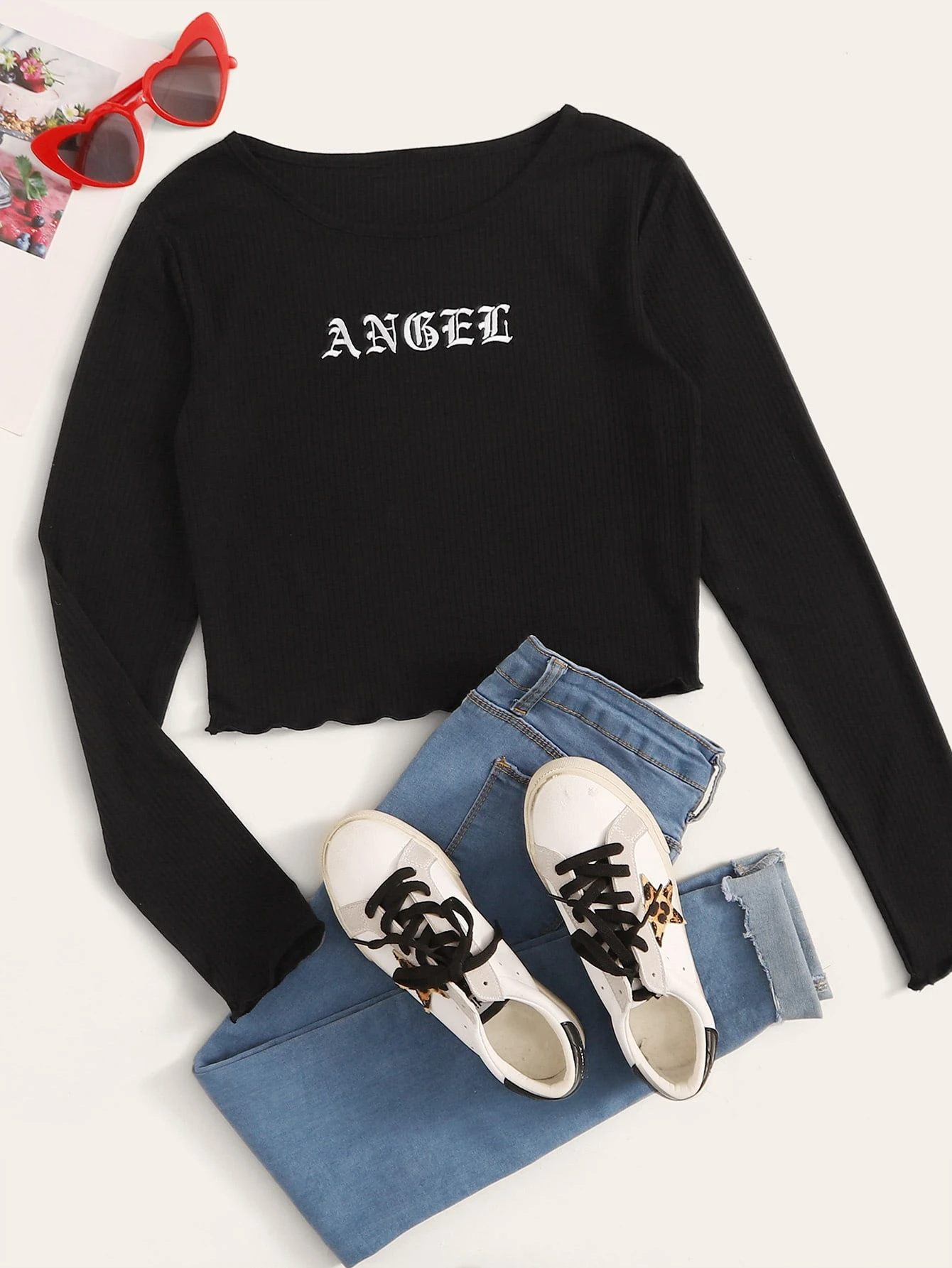 Camiseta corta ribete fruncido con bordado de letra
