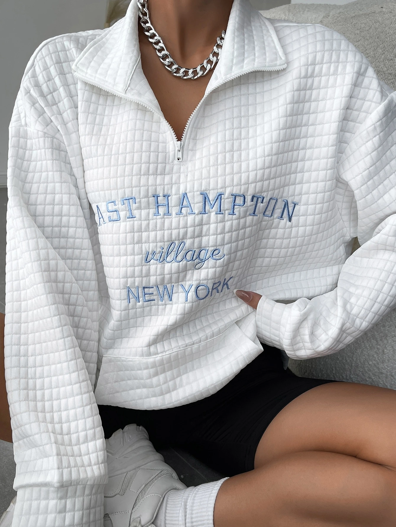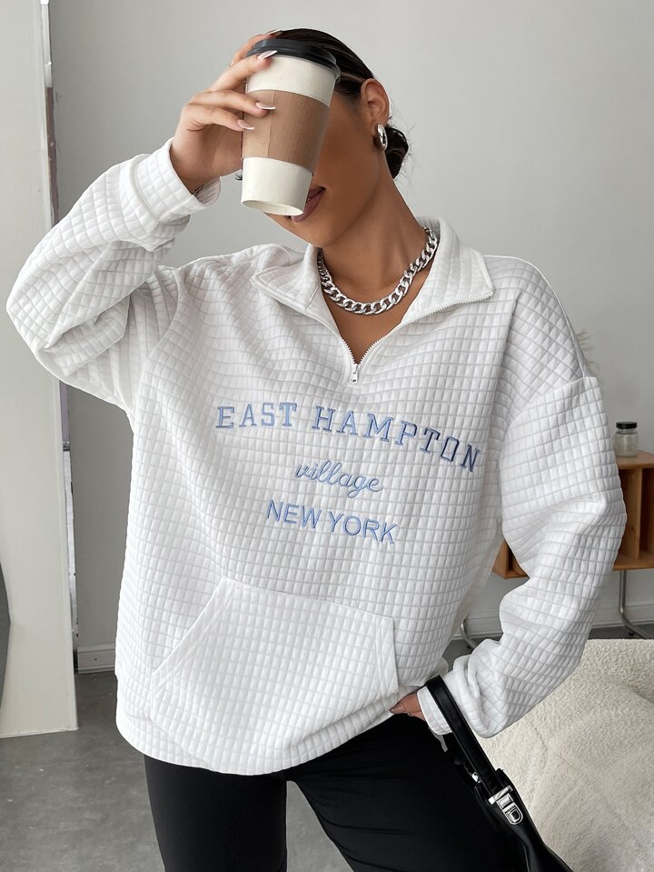 Sudadera con bordado de letra con cremallera media de hombros caídos