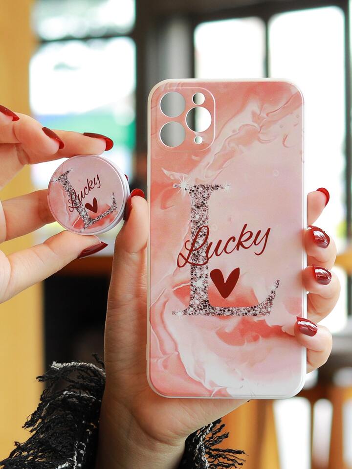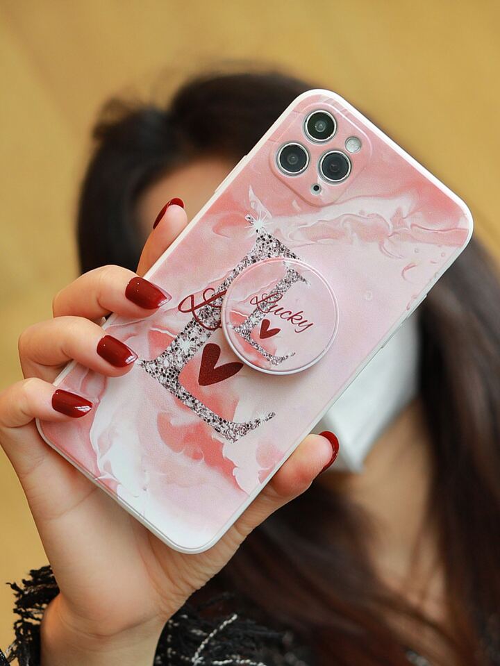 Funda para móvil con estampado de letra con patrón de mármol con agarre de teléfono sobresaliente
