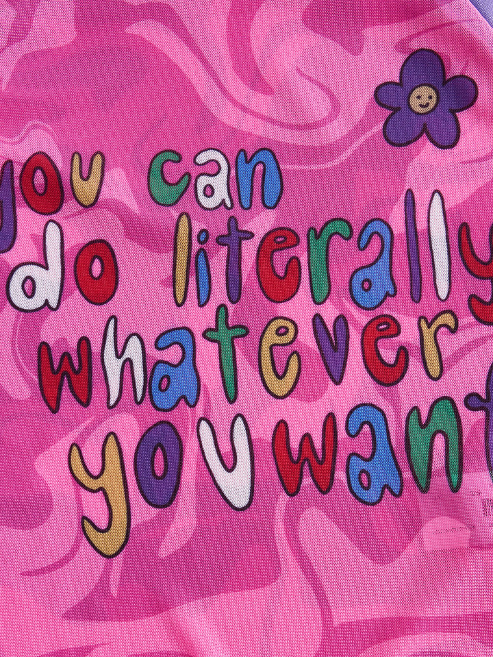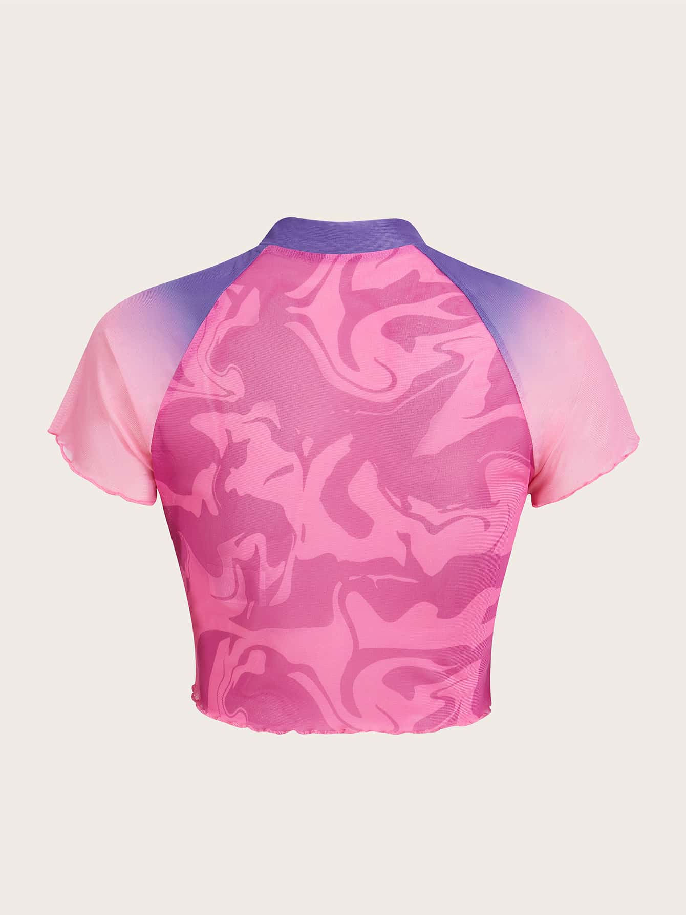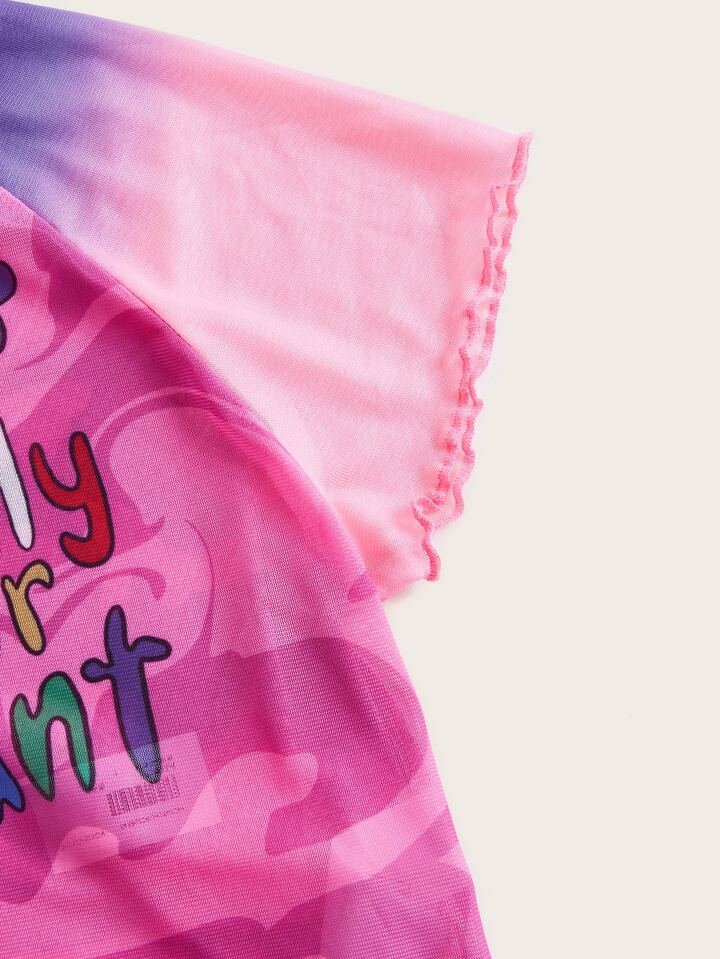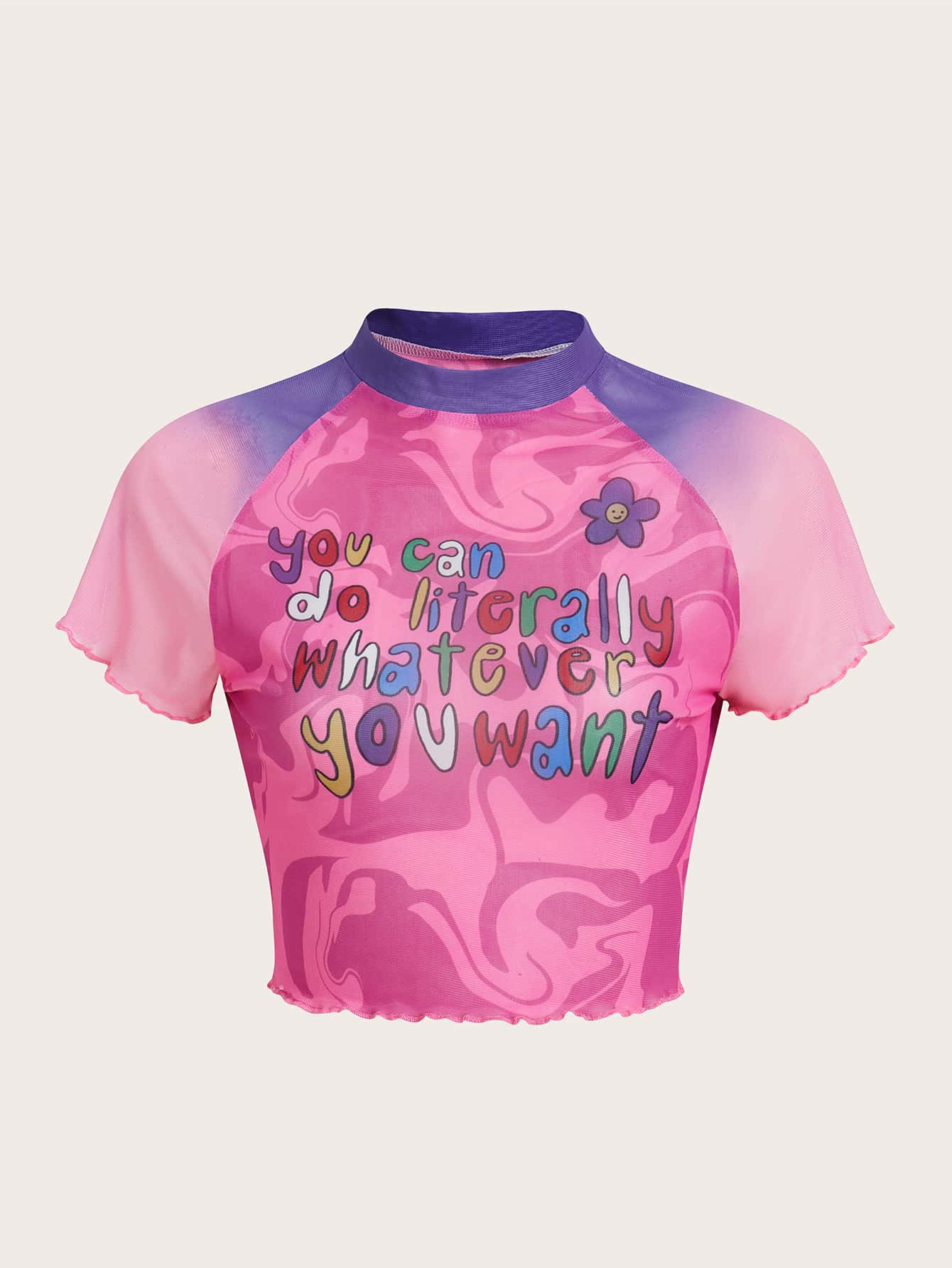 MeeraPage Top con estampado de slogan ribete en forma de lechuga de manga raglán crop de malla