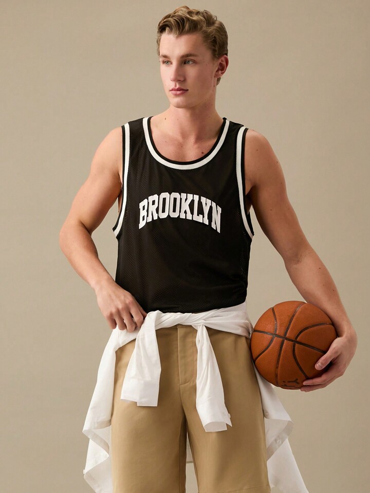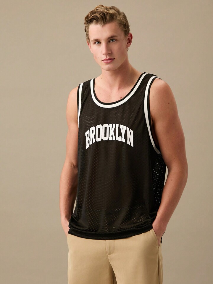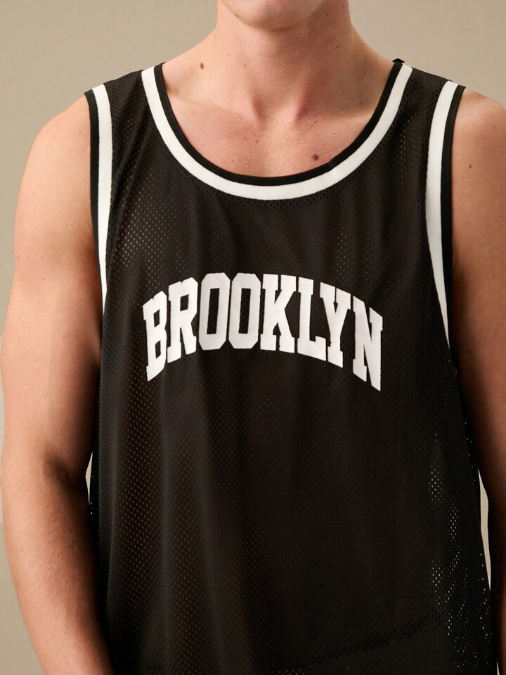 Camiseta de tirantes con gráfico de letra, ribete de contraste y malla para hombre, de vuelta al colegio