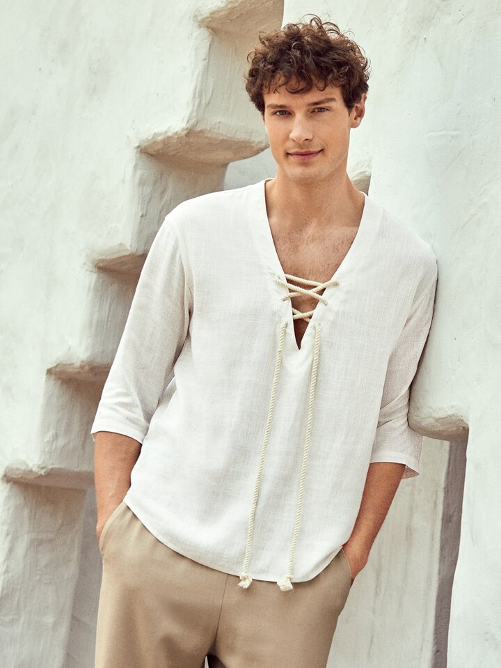 Camisa de manga larga con cordones en el cuello lisa para hombres, para vacaciones