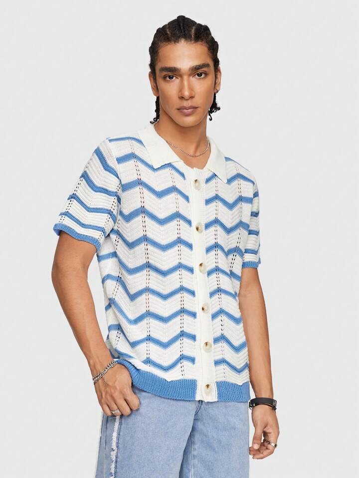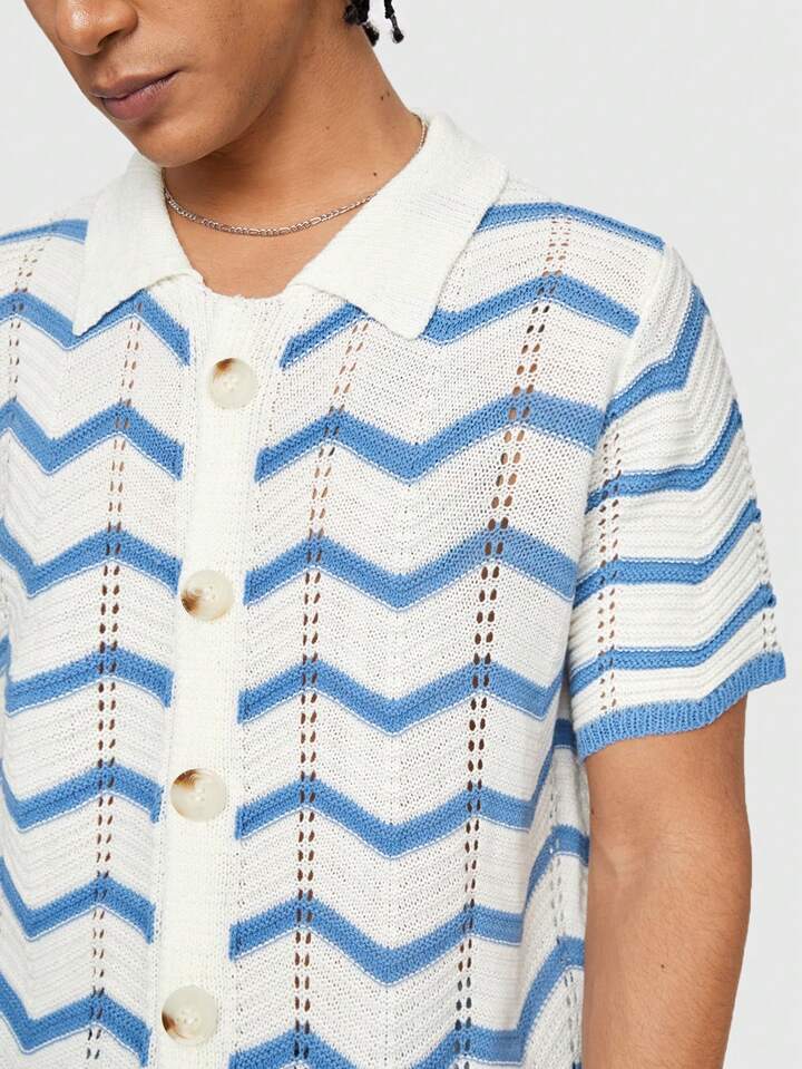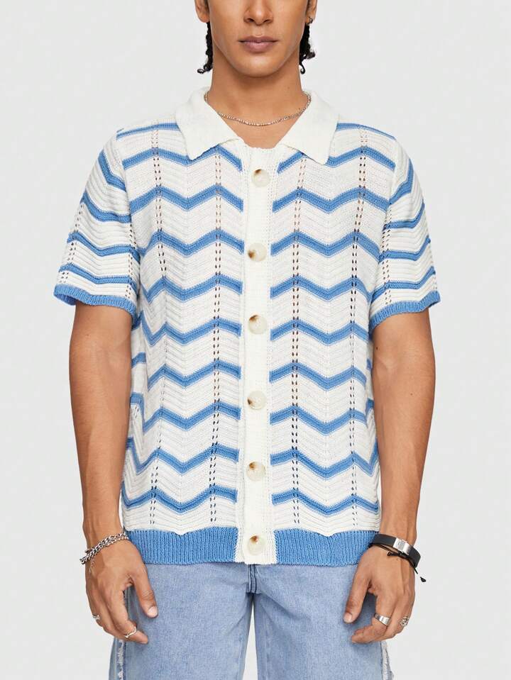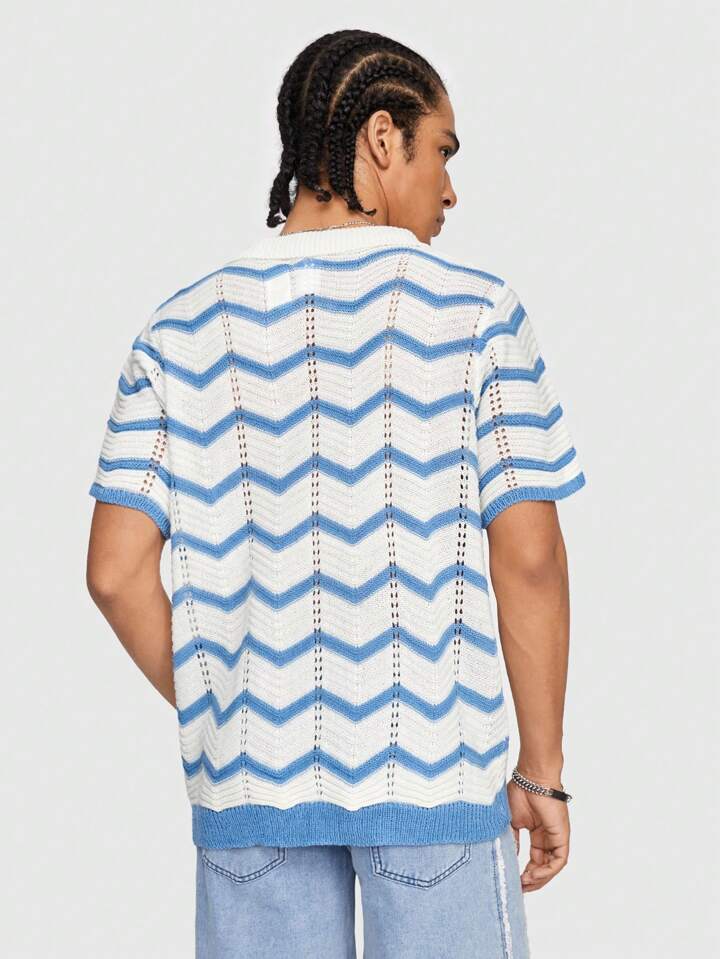 Camiseta de punto casual con rayas onduladas para hombres de manga corta hueca y con botones sencillos de verano