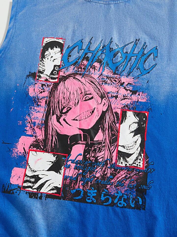 Anime Camiseta de tirantes con cuello redondo para hombres con estampado de letras y dibujos animados