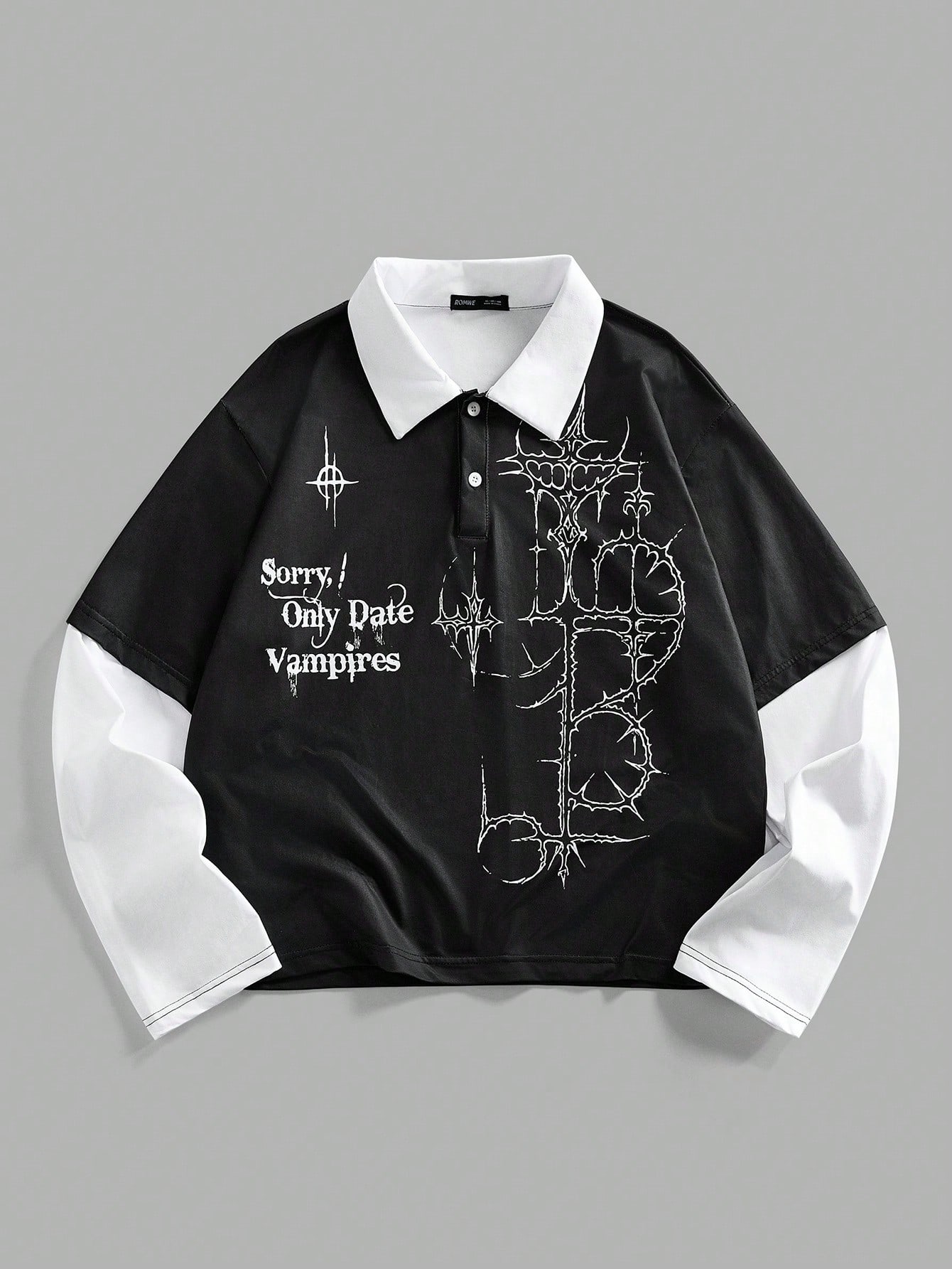 Goth Camiseta casual de hombre con estampado de parches de color contrastante y eslogan, otoño