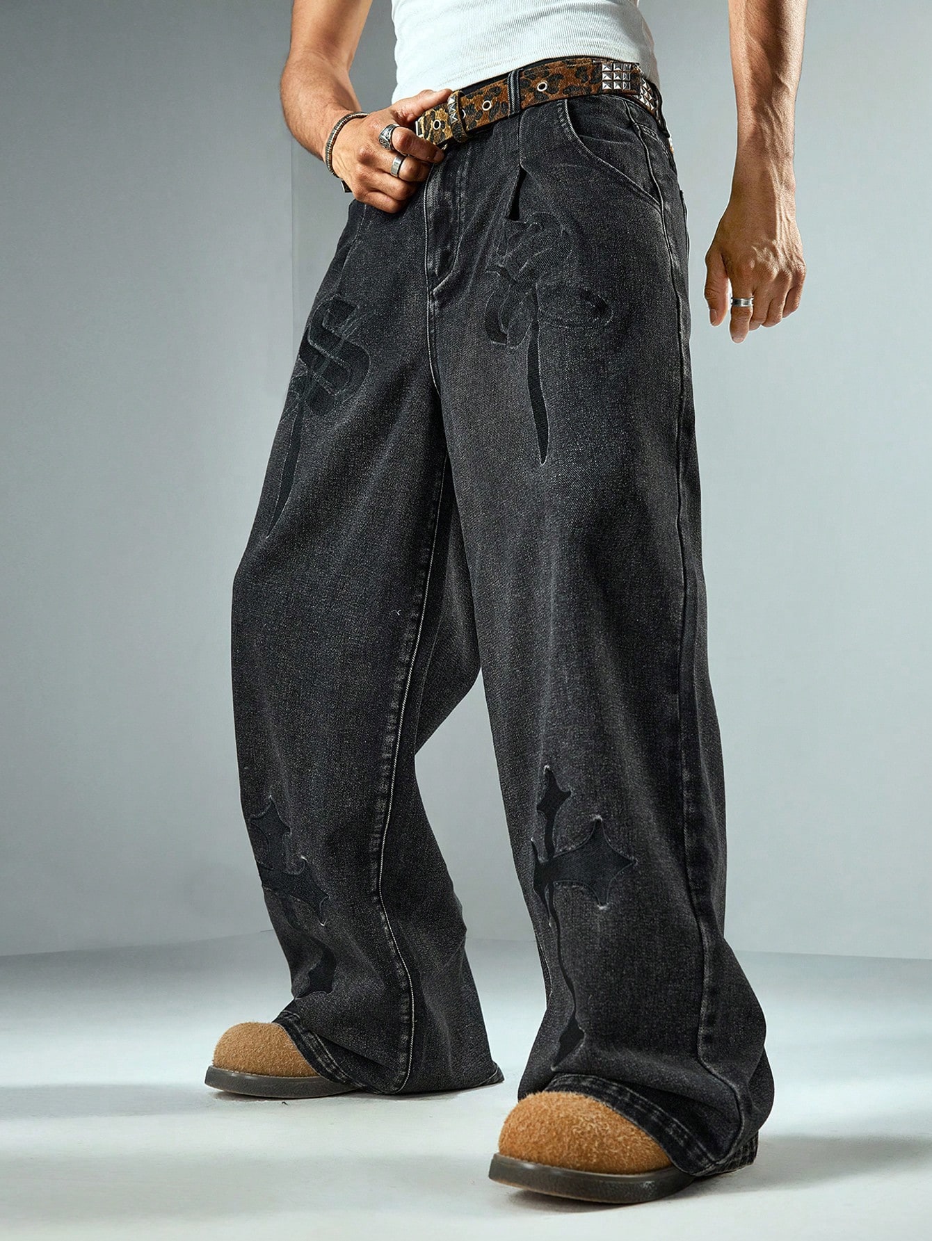 Jeans anchos y sueltos de moda casual con estampado de cruz lavados para hombres