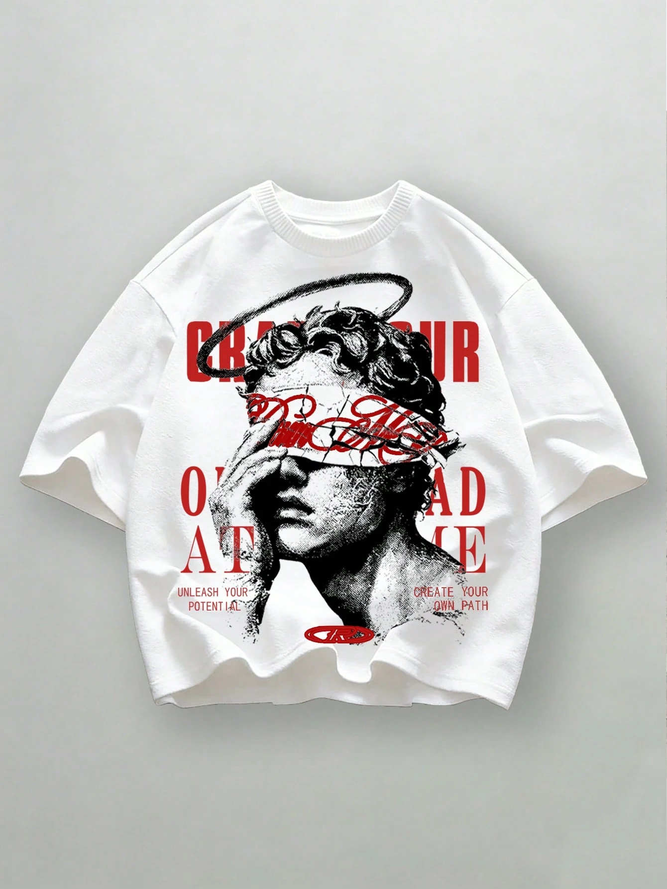 Camiseta blanca de manga corta con estampado de figura y letra, casual y de moda para el uso diario y el transporte, para hombre, verano