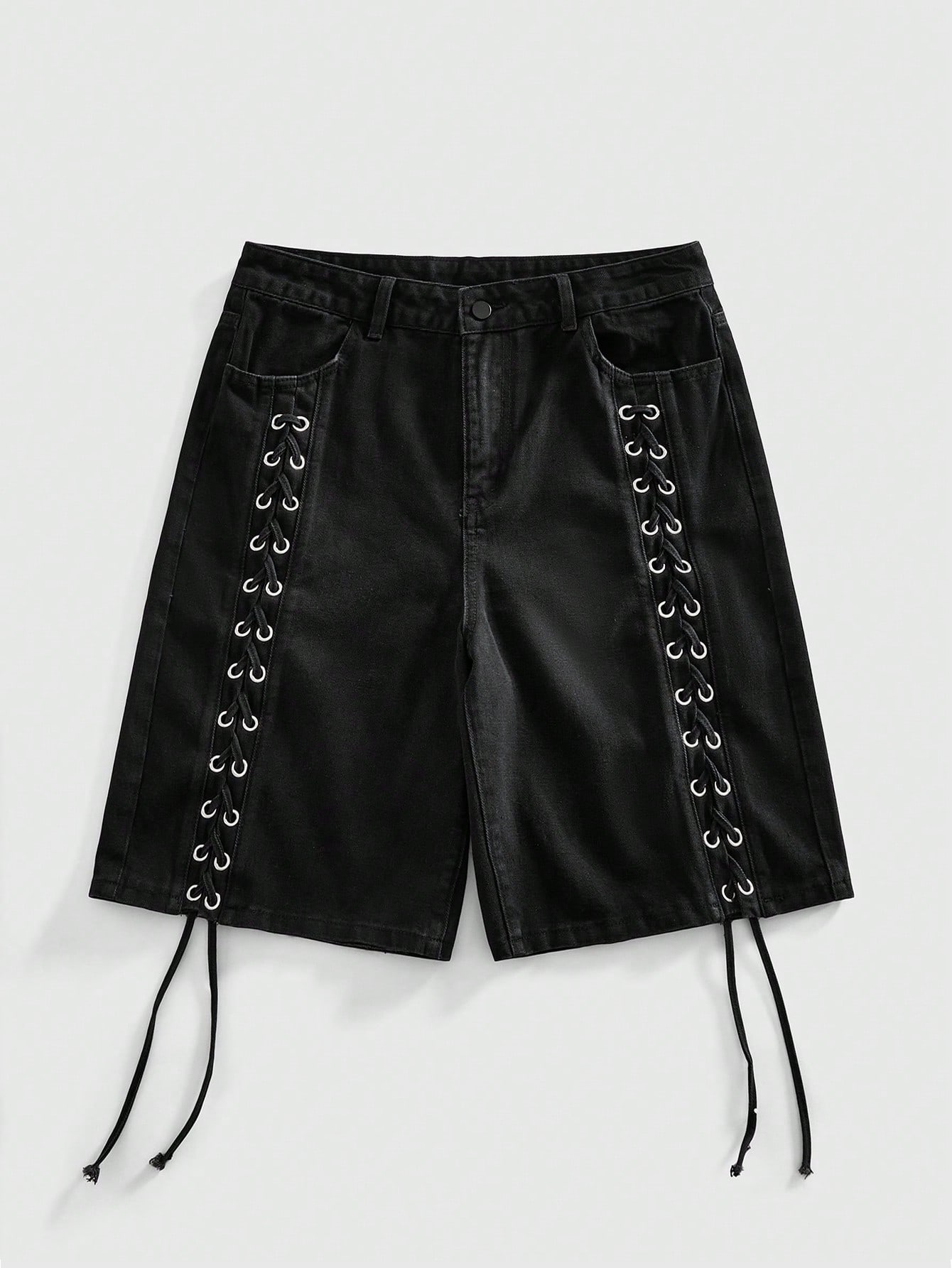 Pantalones cortos de mezclilla holgados con cordón decorativo para hombre