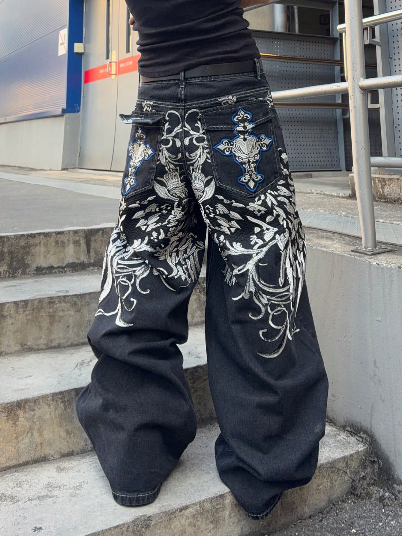 Jeans de pierna ancha con bolsillo bordado y ajuste holgado para hombre