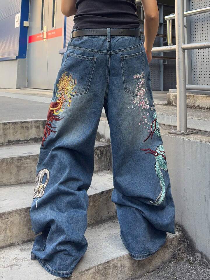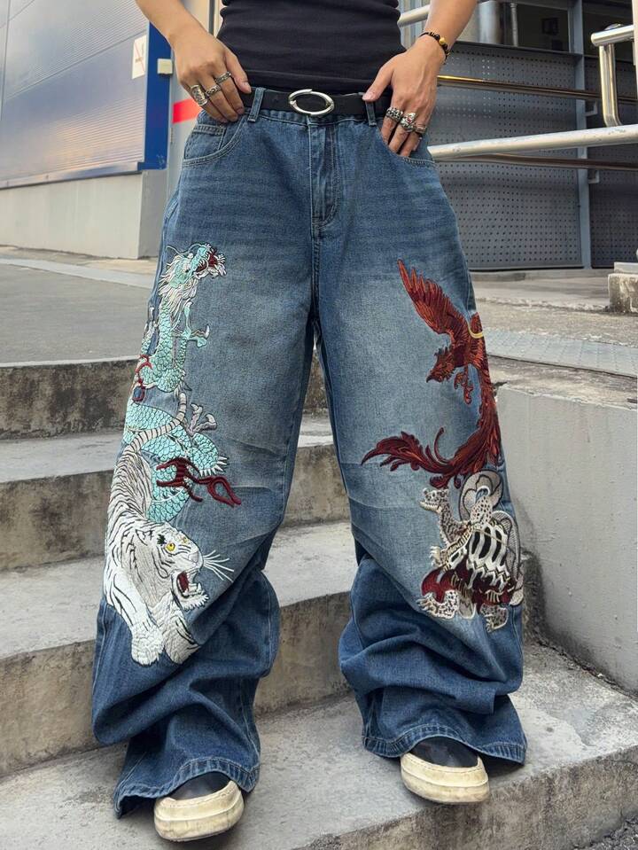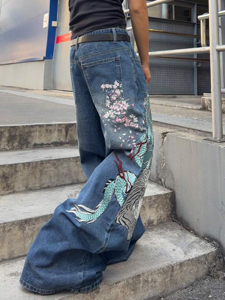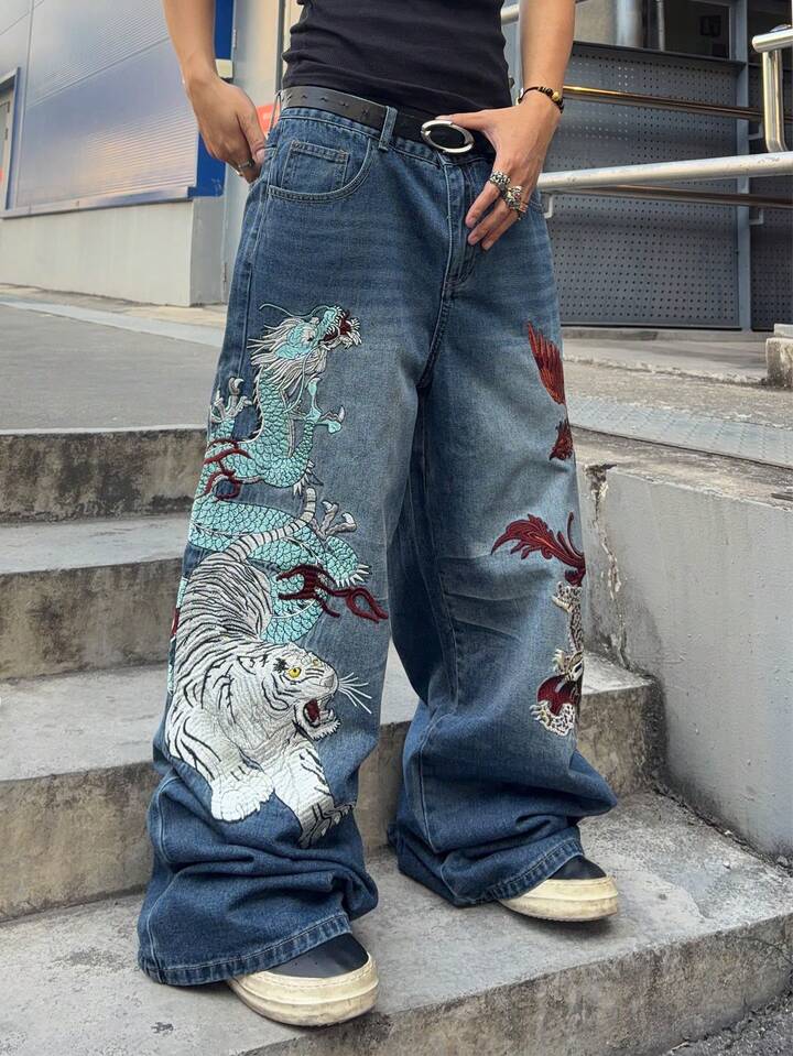 Jeans de corte holgado con patrón bordado para hombre