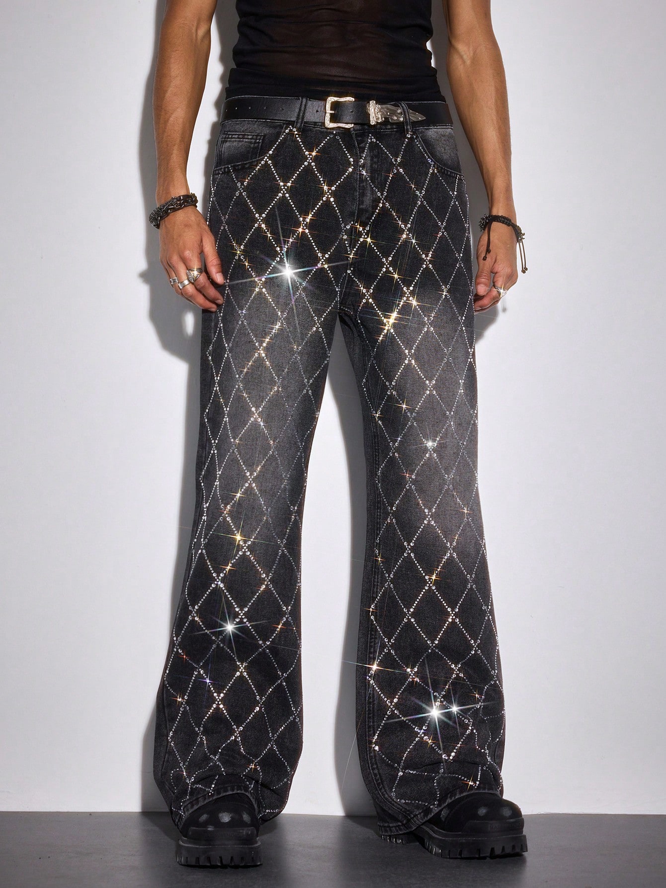 Jeans de corte holgado con bolsillos en diagonal y lavado con piedras rhinestone para hombre
