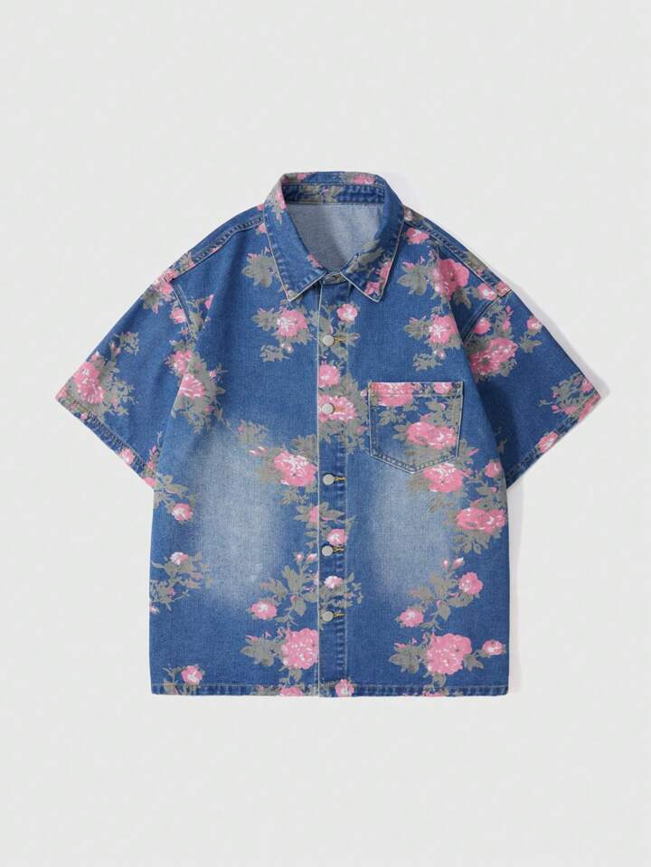 Chaqueta vaquera casual holgada de una sola hilera de botones con bolsillo y manga corta con estampado floral para hombre