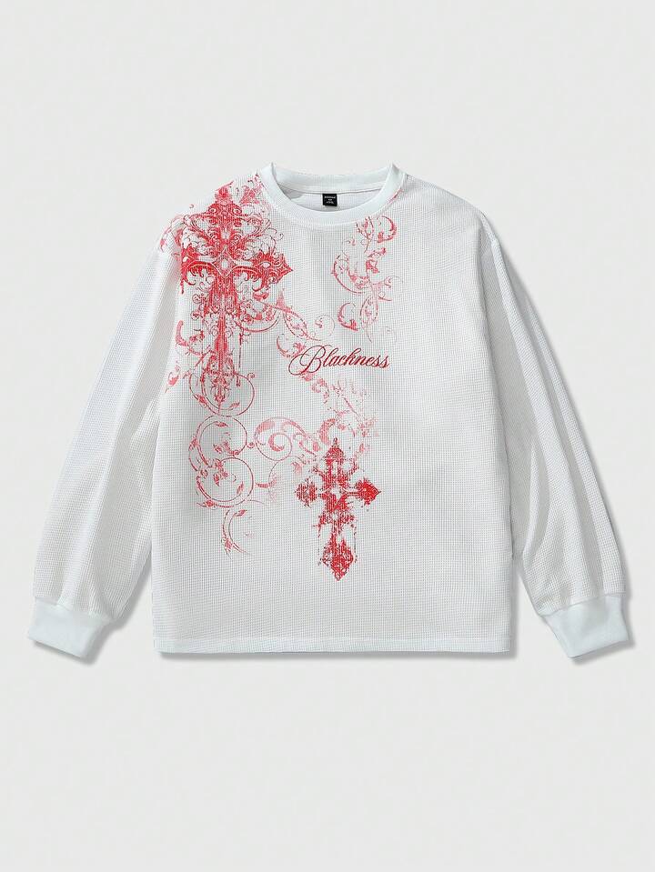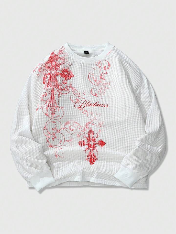 Goth Sudadera con cuello redondo de tela de gofre con estampado de cruz gótica para hombre, apta para uso diario, otoño/invierno