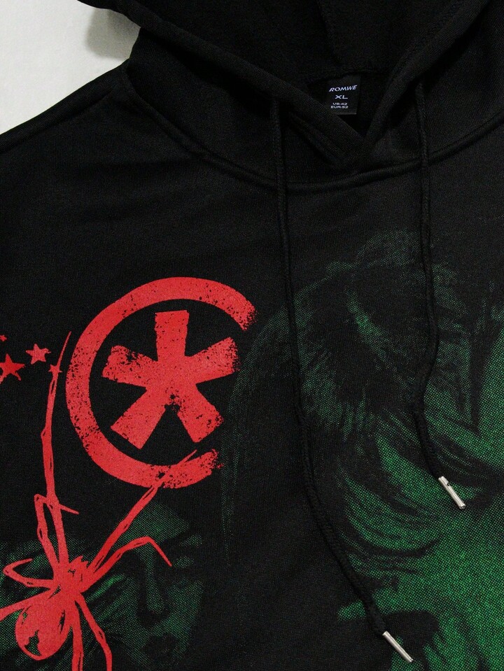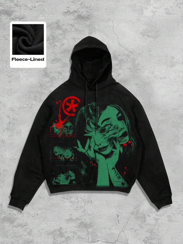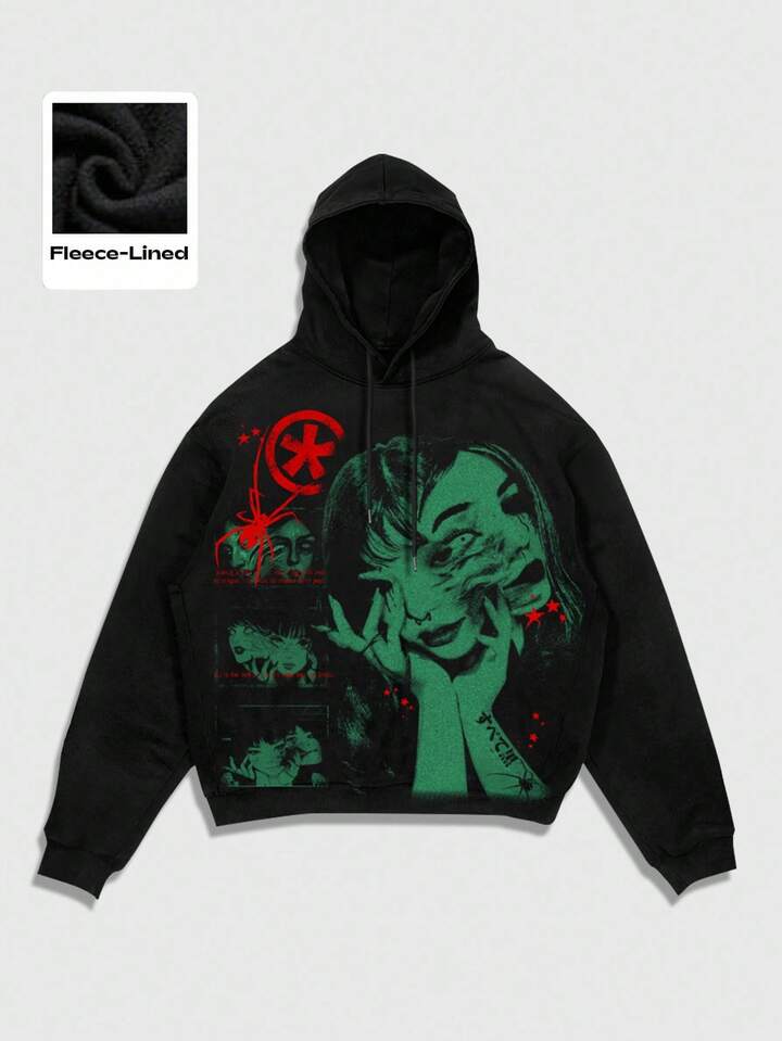 Anime Sudadera con capucha de felpa con estampado gráfico y cordón para hombre, casual para otoño/invierno