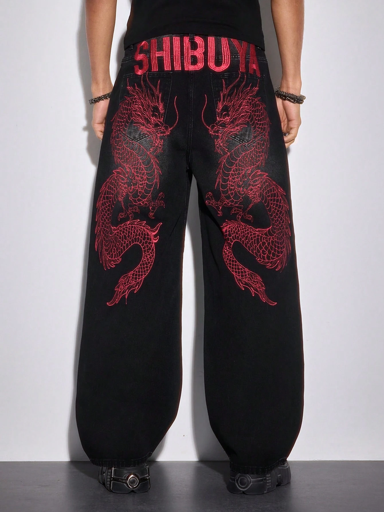 Jeans casuales holgados con bordado de letras y dragón en el bolsillo para hombres