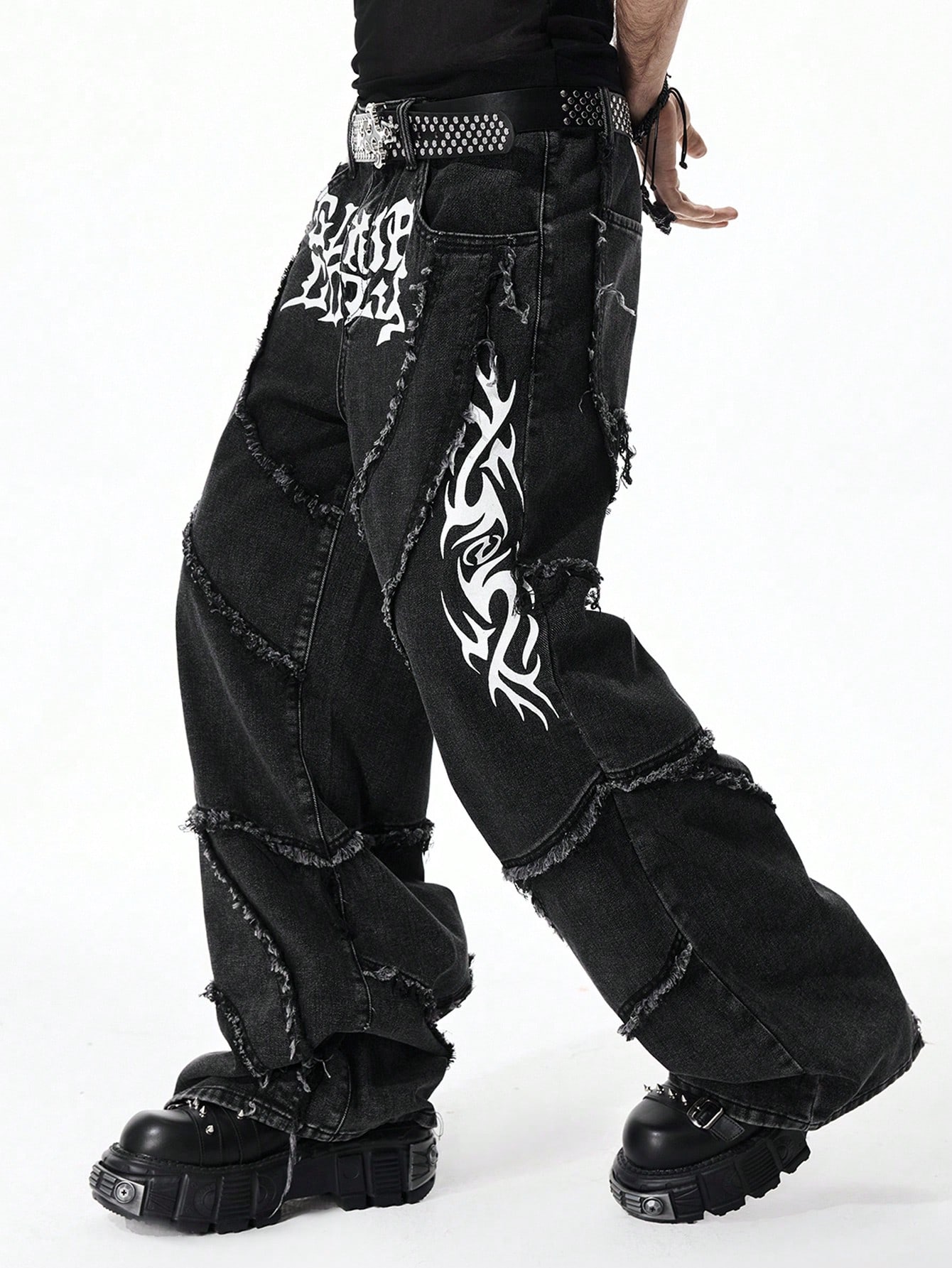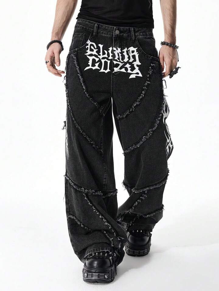 Jeans casuales holgados con bolsillo estampado con letras y efecto desgastado para hombres