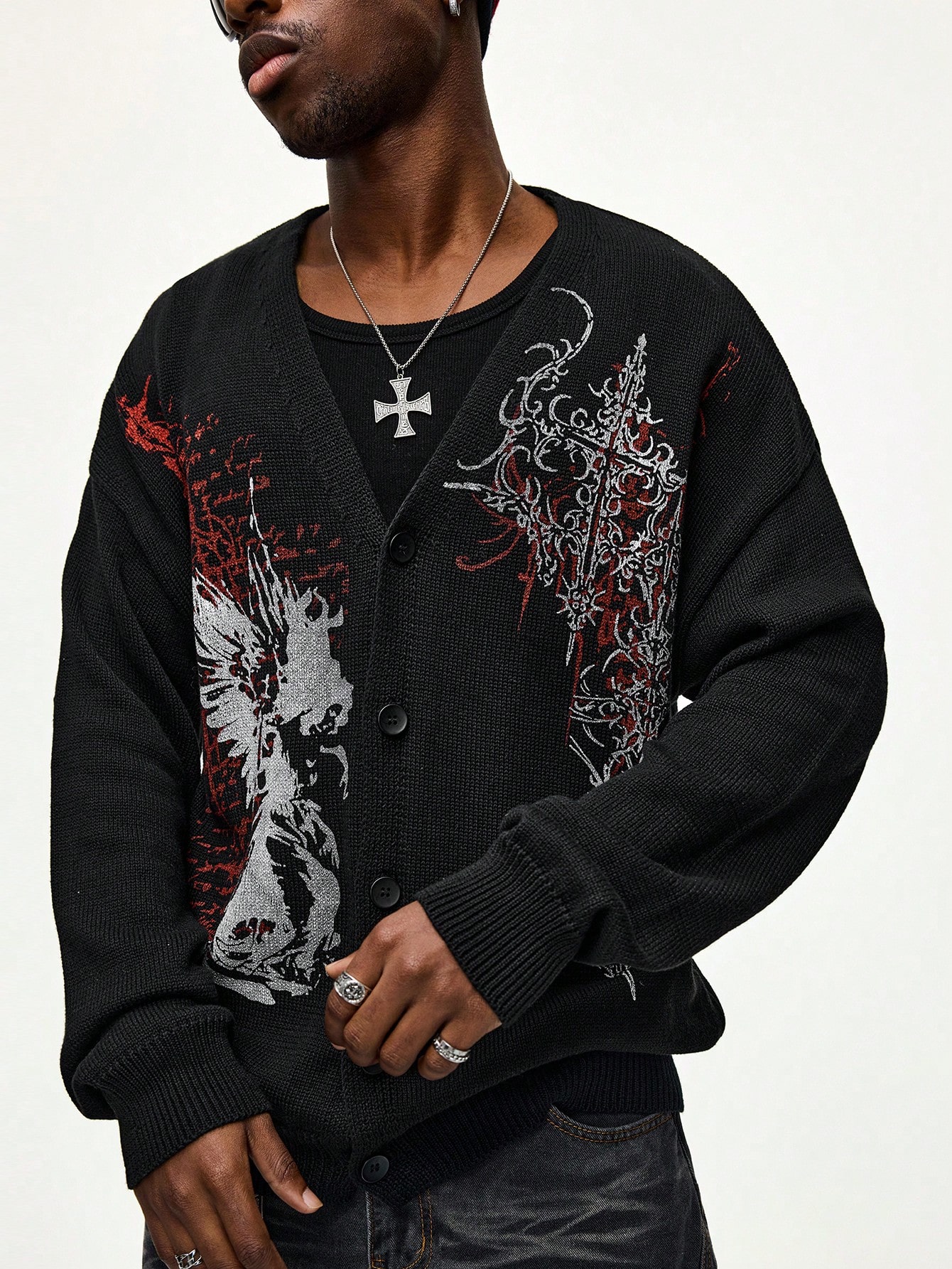Cárdigan de punto casual de manga larga con hombros caídos y estampado de jacquard cruzado, corte holgado para hombre