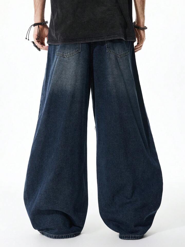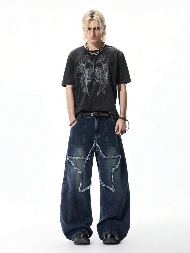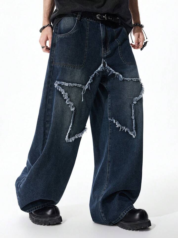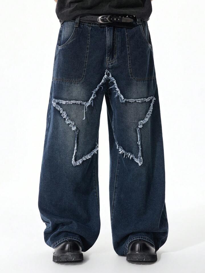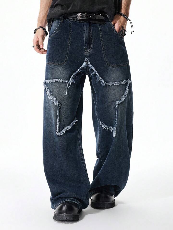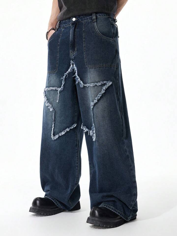 Jeans personalizados para hombres con pierna ancha, bolsillos y bordado de estrella de cinco puntas en contraste de color