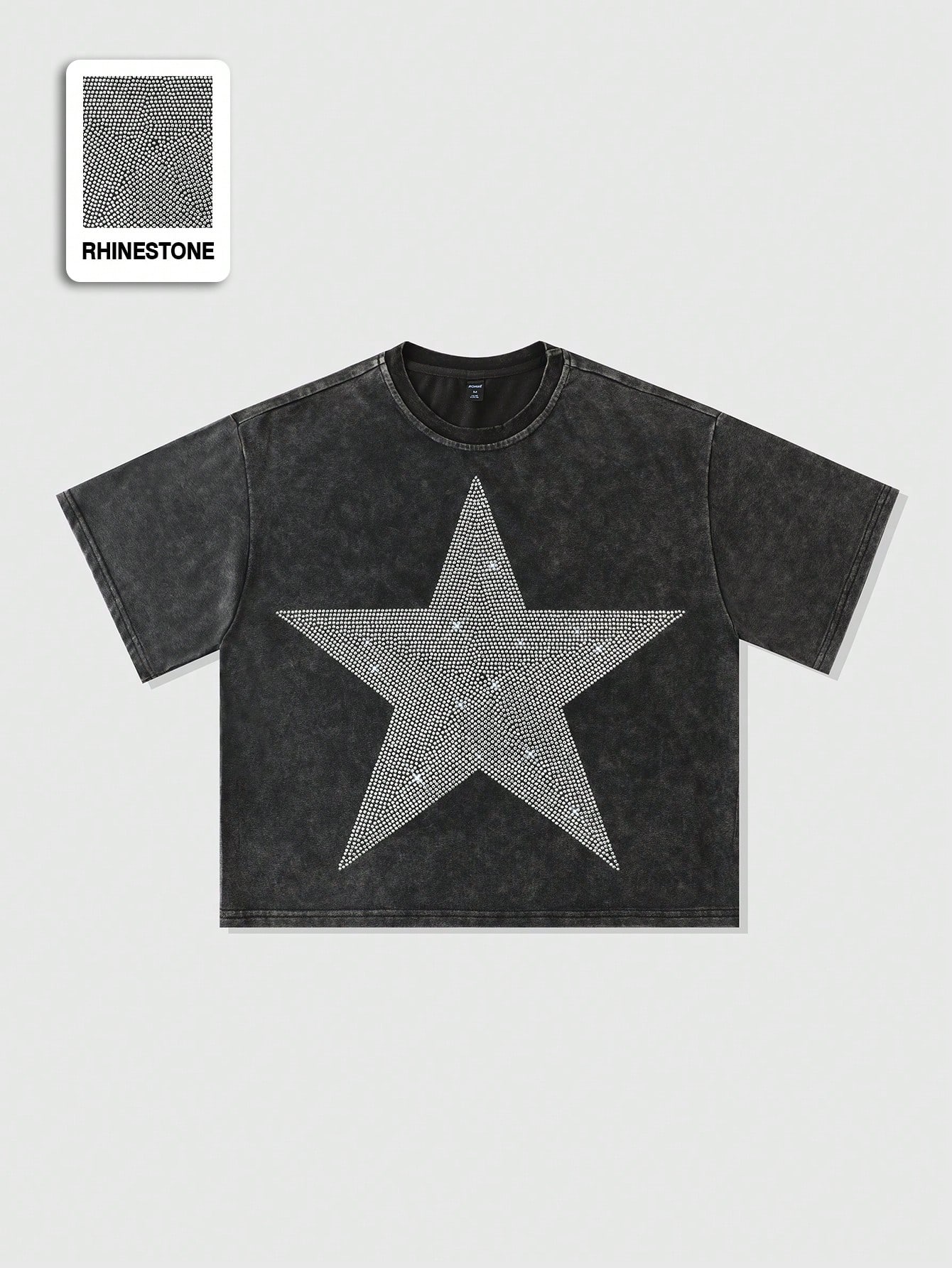 Camiseta suelta de corte corto con lavado de rhinestones para hombres, para rave