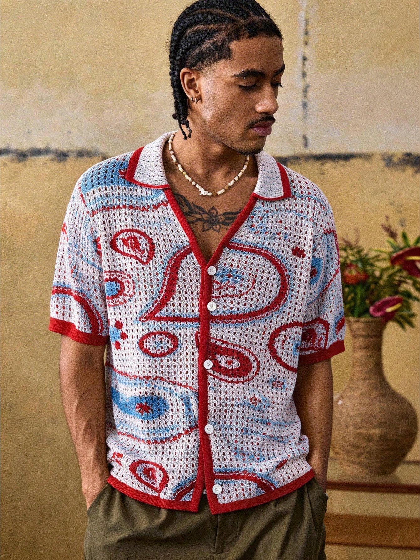 Cárdigan casual de punto con estampado de cachemira de una sola hilera de manga corta para hombre