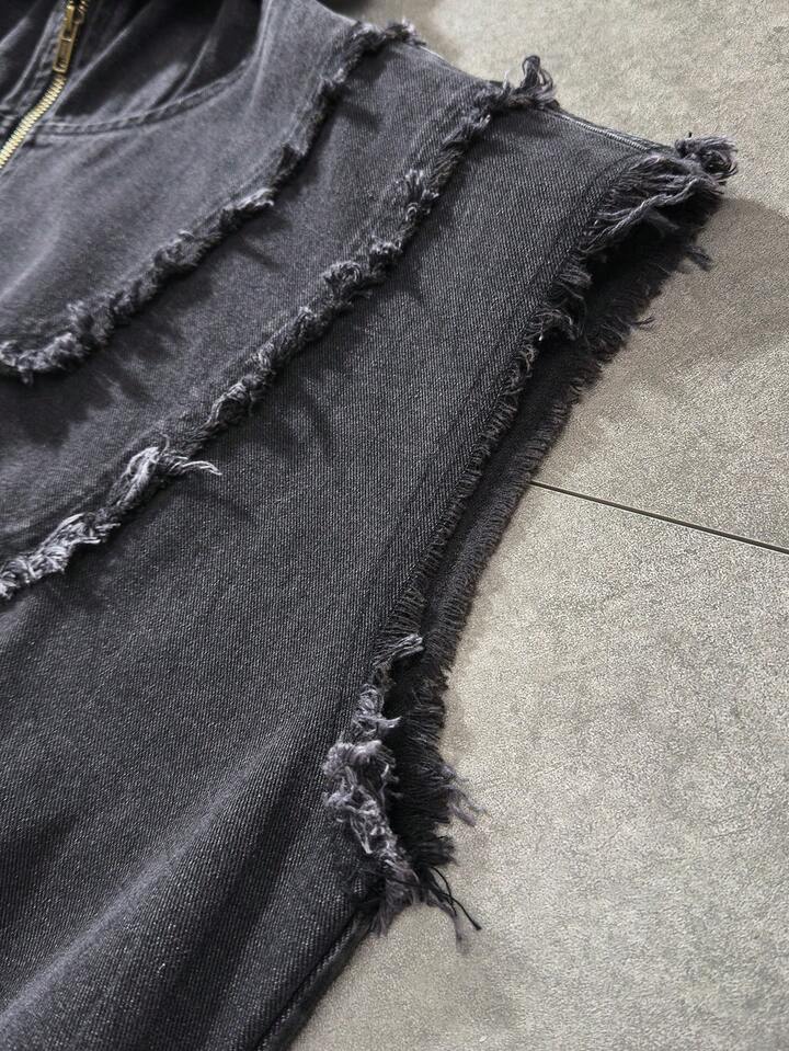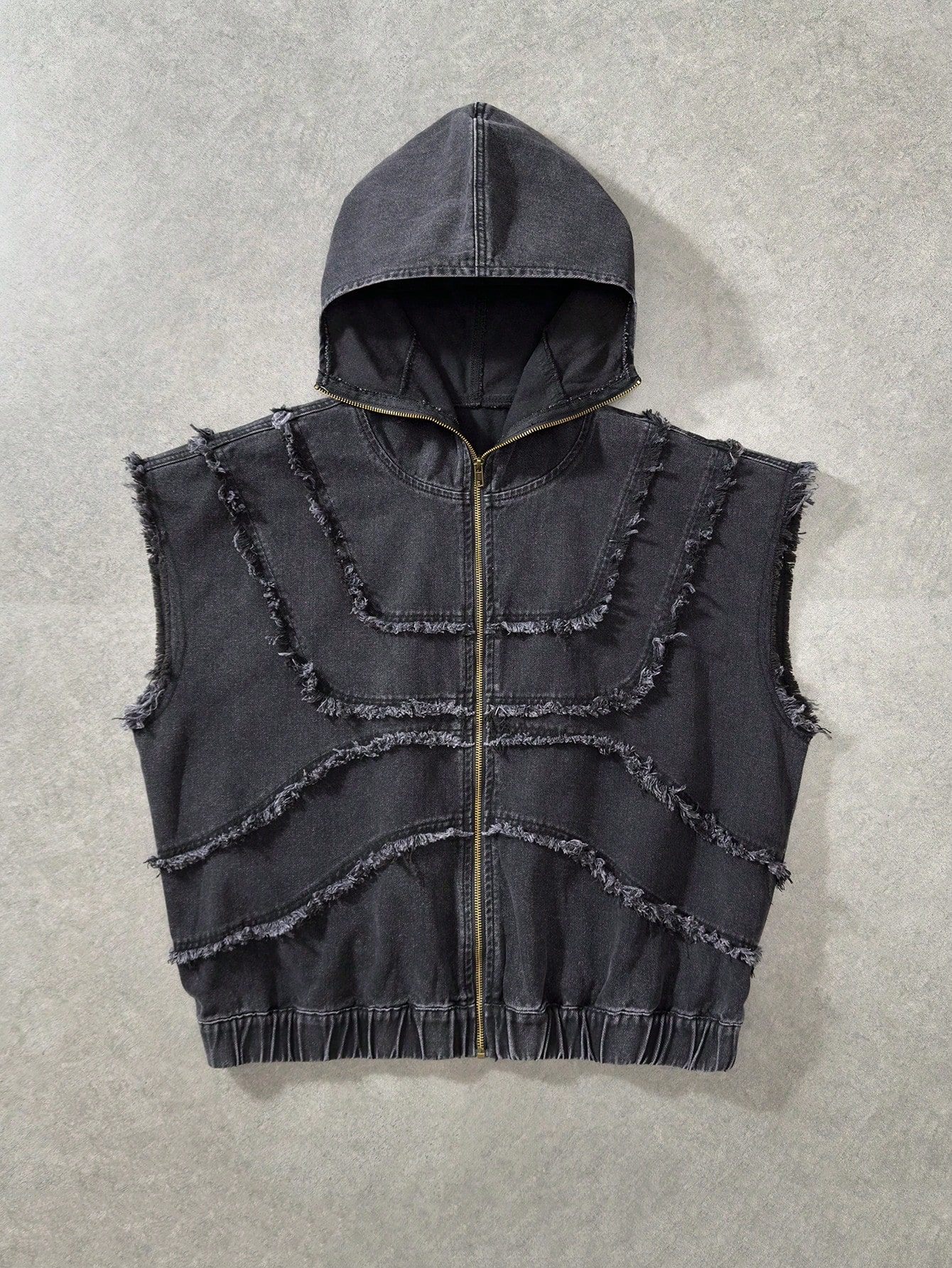 Chaqueta vaquera con capucha y cremallera sin mangas con dobladillo deshilachado para hombre