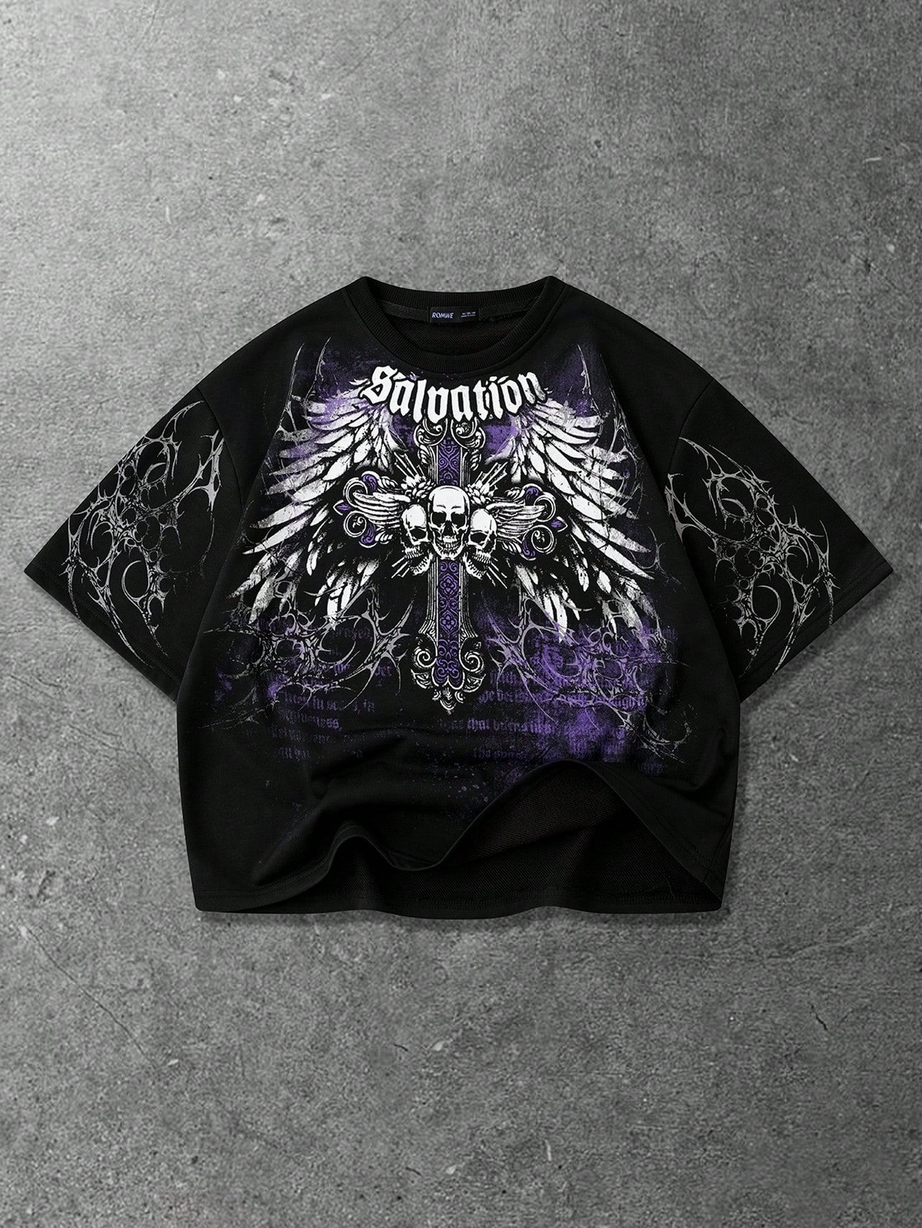 Camiseta de manga corta casual de cuello redondo con eslogan y estampado de calavera para hombres, corte holgado