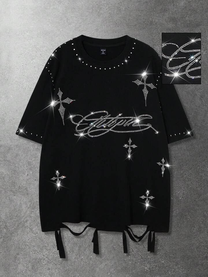Camiseta de manga corta con estampado de cruz americana con strass y dobladillo desgastado para hombre