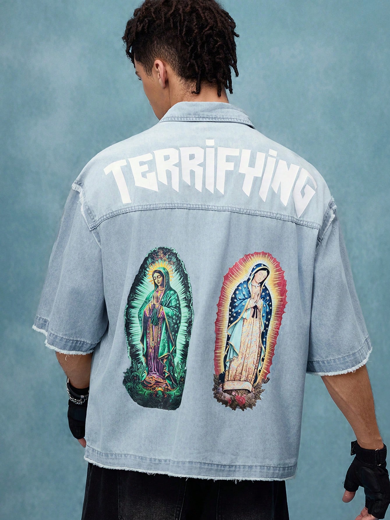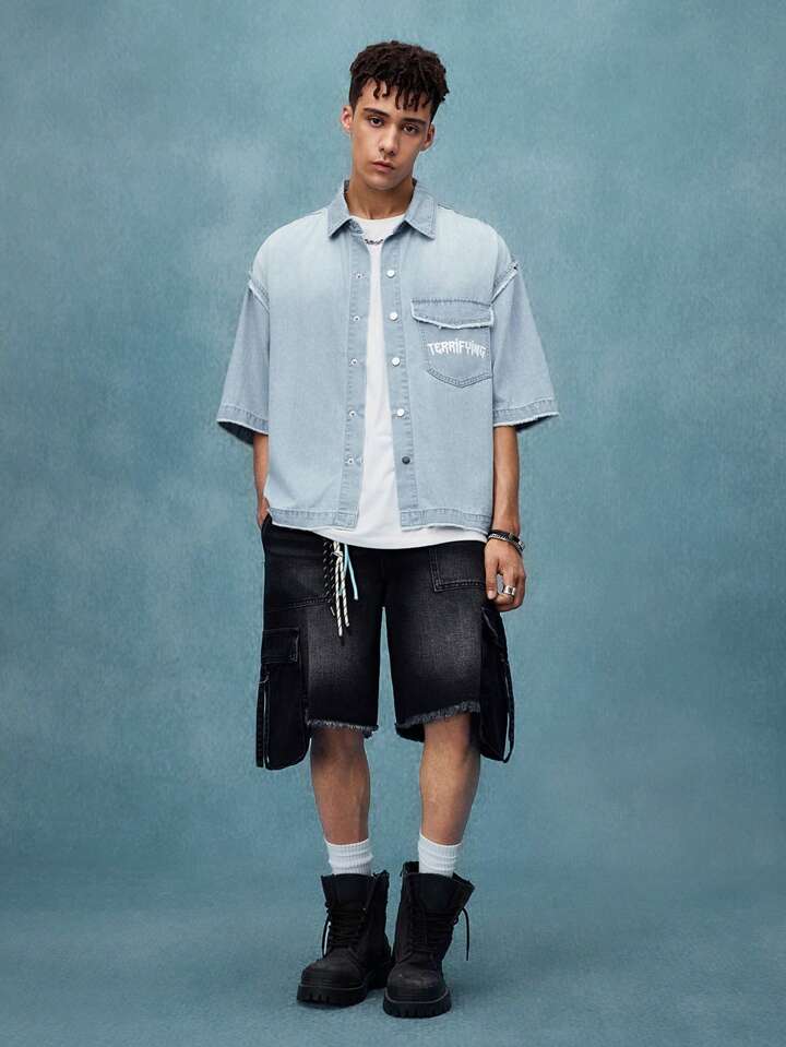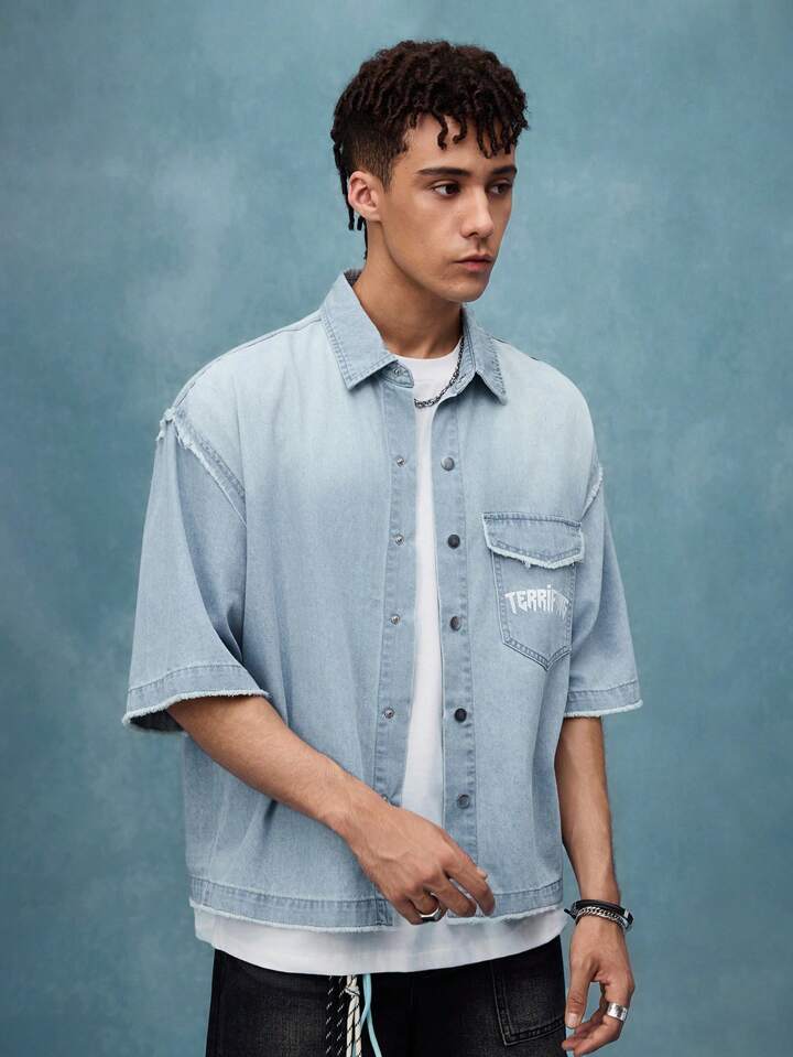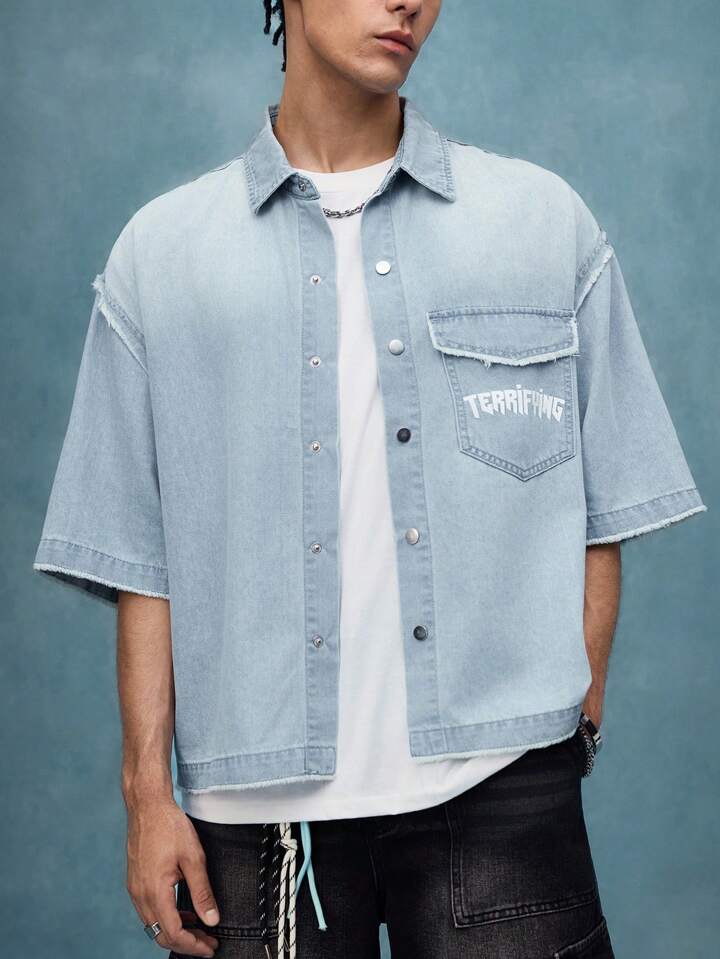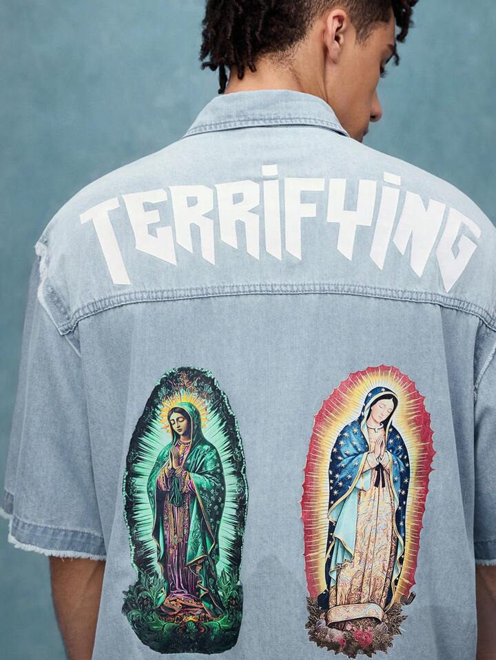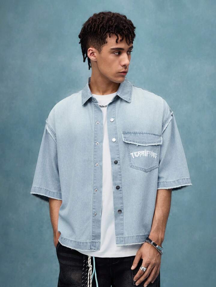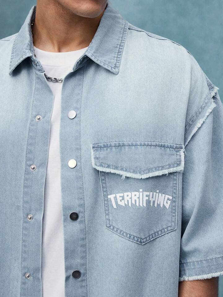 Street Life Camisa de mezclilla de corte holgado con estampado, top de manga corta de mezclilla