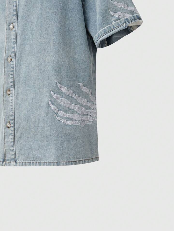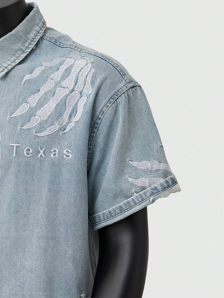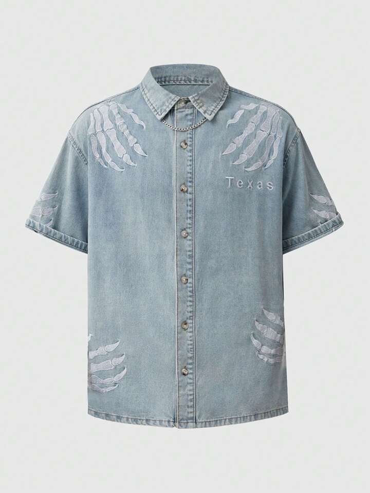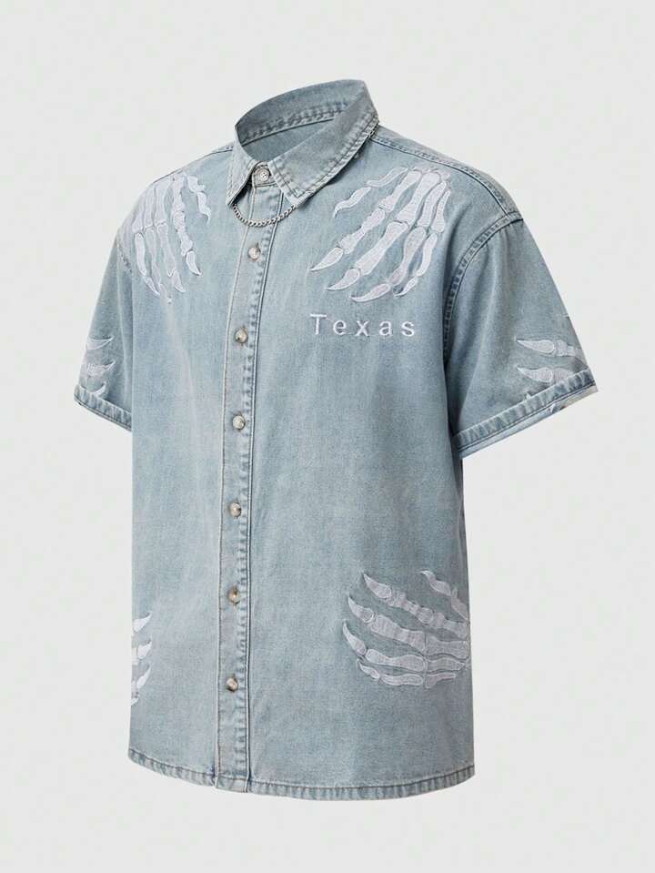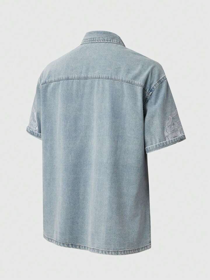 Street Life Camisa casual de mezclilla de una sola de botones con bordado de letra en manga corta para hombres